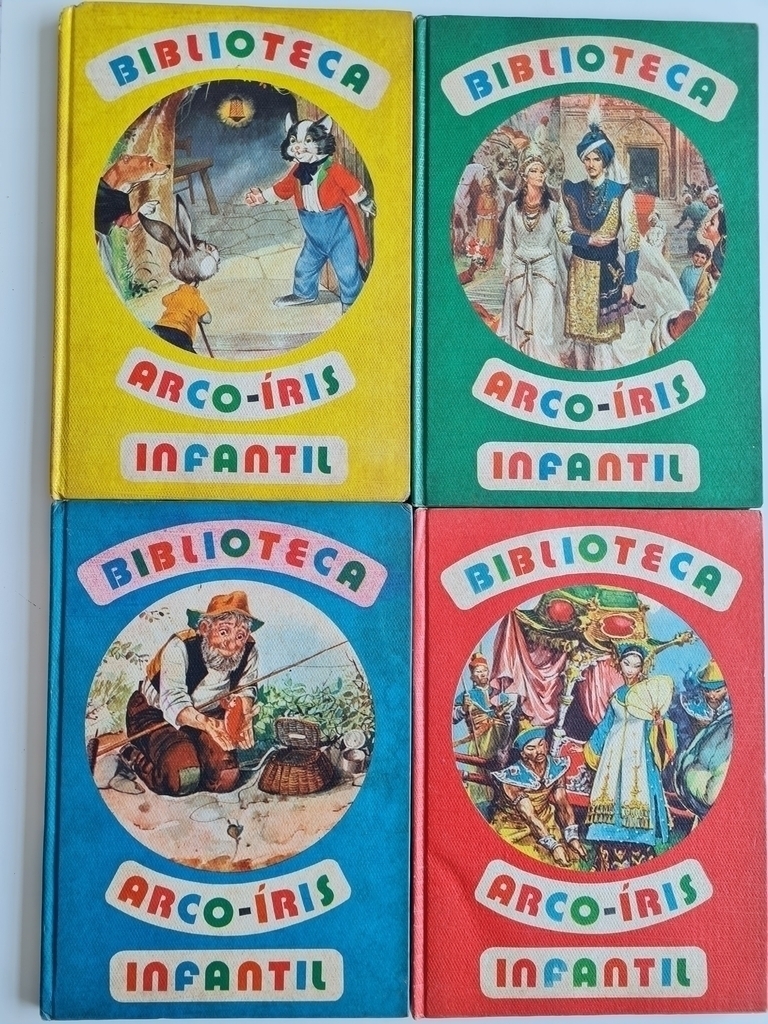 A Biblioteca Arco-íris Infantil tem todas as cores do mundo encantado da criança. São as mais fascinantes jóias da Literatura Infantil, preciosas para a adequada formação do caráter e para o mais sadio entretenimento. E tudo maravilhosamente ilustrado a cores por grandes artistas internacionais. Valorizando – e orientando sempre – a infância de suas crianças. Volume 1: A gata borralheira; O peixinho e o Pescador; O super ladrão se converte; Os Três Músicos; Fúlvia, a corça e o gatinho; Volume 2: Ali Babá e os quarenta ladrões; O Bom Carlinhos; O Príncipe Tartaruga; A Leiterinha e a Bilha de Leite; Volume 3: ABU KIR e ABU SIR; A estranha aventura de Liú; A raposa e as uvas; O Gato, a Doninha e o Coelho; Volume 4: O Pássaro falante, Gruda, Cisne!; A Pastorazinha e o limpador de chaminé; O Livrão dos encantamentos.