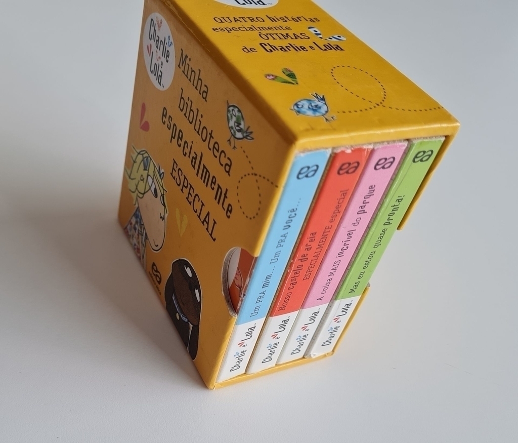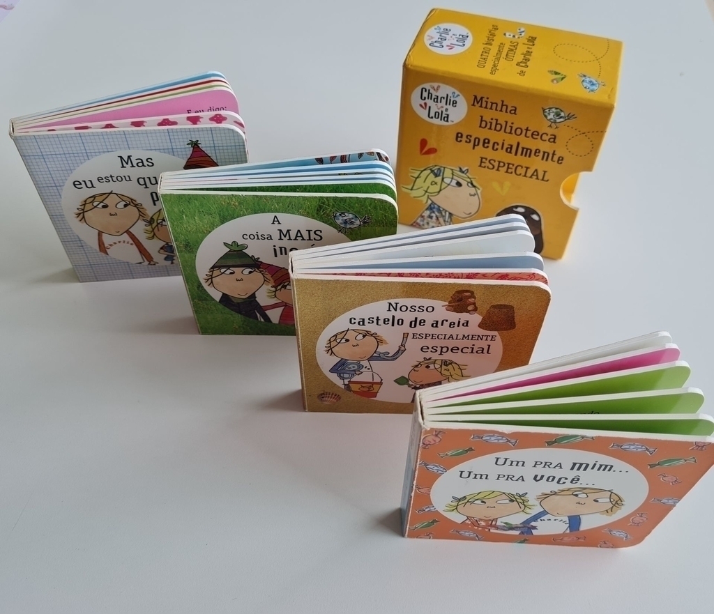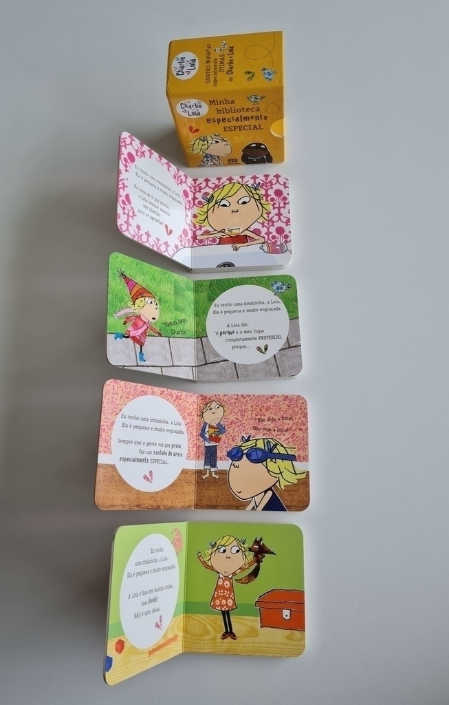 Cada livrinho desta caixa traz uma história de Charlie e Lola. Em “A coisa mais incrível do parque”, Lola conta coisas muito legais que acontecem no parque. “Um pra mim… um pra você… ” aborda um assunto com o qual Lola não lida bem: dividir. Já em “Nosso castelo de areia especialmente especial”, os irmãos passam um dia na praia. Por fim, em Já estou quase pronta, Lola se arruma para ir à escola com a ajuda de Charlie.