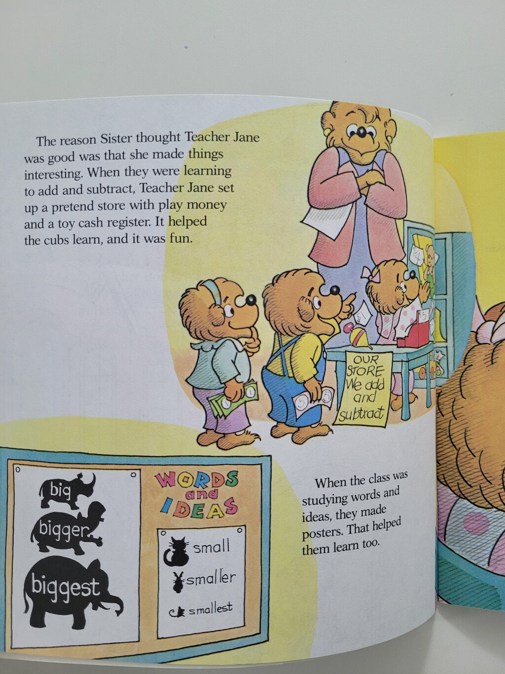 Throughout its history, the Berenstain Bears books all follow a basic formula, as stated by the Berenstains: “Papa sets out to instruct Small Bear in some aspect of the art of living and ends up badly the worse for wear, with Small Bear expressing his appreciation for the fine lesson Papa has taught him.” The Bear family originally consisted of Mama Bear, Papa Bear, and Brother Bear, who was known as ‘Small Bear at the time. Mama gave birth to her first daughter, Sister Bear, in the 1974 book The Berenstain Bears’ New Baby. Sister became the Bear family’s only daughter until 26 years later, Mama would become pregnant in the book The Birds, the Bees, and the Berenstain Bears. In the book The Berenstain Bears and Baby Makes Five, which was also published in 2000, Mama give birth to Honey Bear, the second daughter of the Bear family. A majority of the issues that the Berenstain Bears face are similar to what children go through such as bullying, visiting the doctor, getting into fights with loved ones, obesity, and throwing tantrums. The Berenstains used their family experiences as inspiration for the books, with Stan credited for their continued relevance: “Kids still tell fibs and they mess up their rooms and they still throw tantrums in the supermarket … Nobody gets shot. No violence. There are problems, but they’re the kind of typical family problems everyone goes through.”