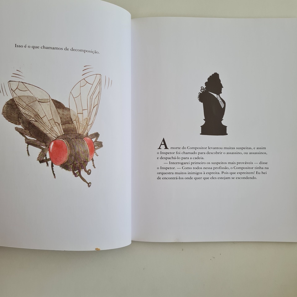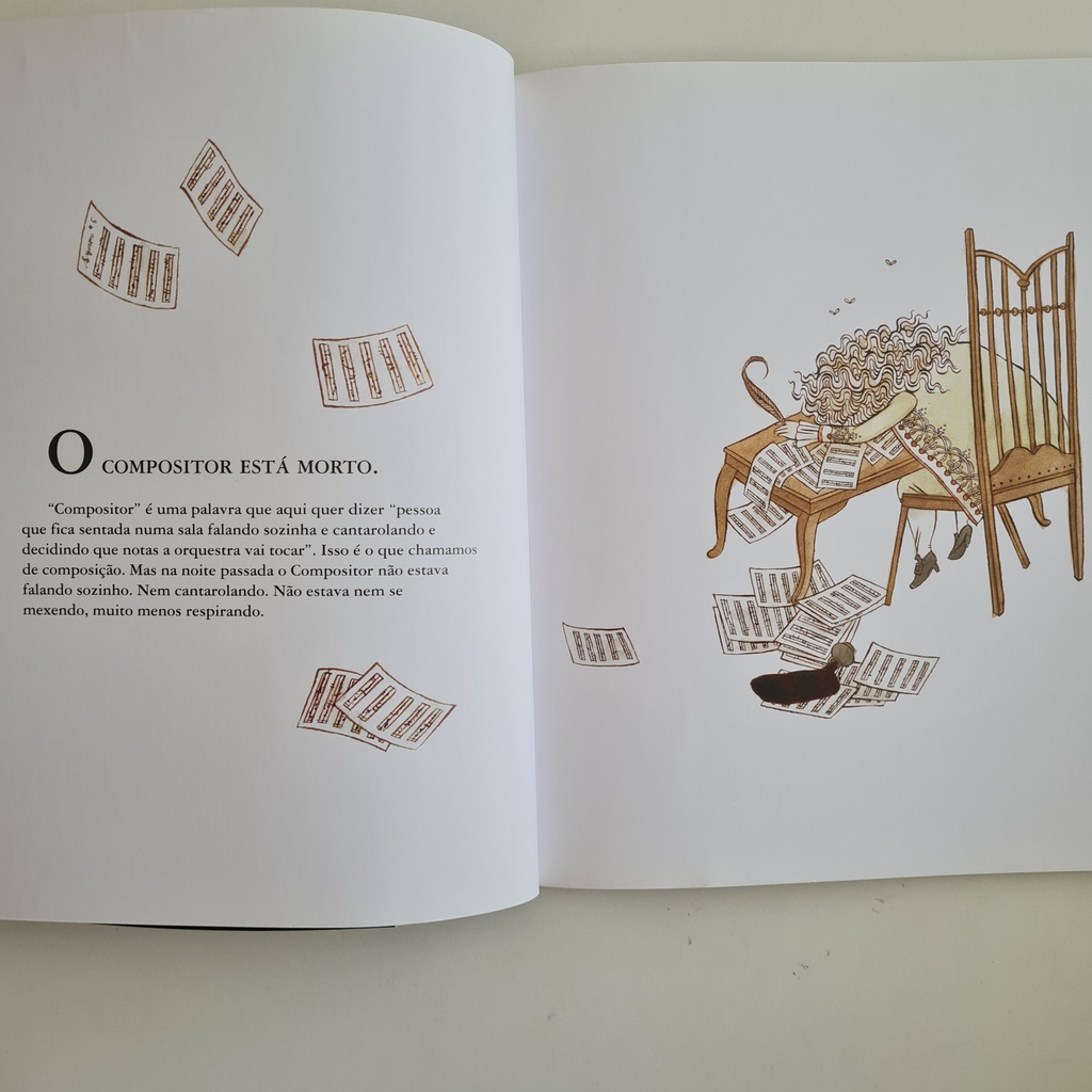 Quem já ouviu uma orquestra tocar, sabe que os músicos têm toda a pinta de culpados. Onde estavam os Violinos na noite do crime? Alguém viu a Harpa? Não parece que o Trompete ficou um pouco nervoso demais, reclamando de tudo? Neste desconcertante e misterioso crime, cada suspeito parece ter um motivo, mas todos têm álibis – os Violinos estavam tocando graciosas melodias, os Violoncelos estavam no acompanhamento, as Violas estavam reclamando da vida, como sempre, as Flautas estavam imitando passarinhos, os Clarinetes fizeram muitos elogios ao Inspetor, os Trombones se embebedaram e a Tuba ficou em casa com a sua senhora, a Harpa, tomando leite morno numa xicarazinha azul. E, no entanto, o Compositor ainda está morto. Será que os leitores descobrirão o que aconteceu no crime mais bem orquestrado da história?