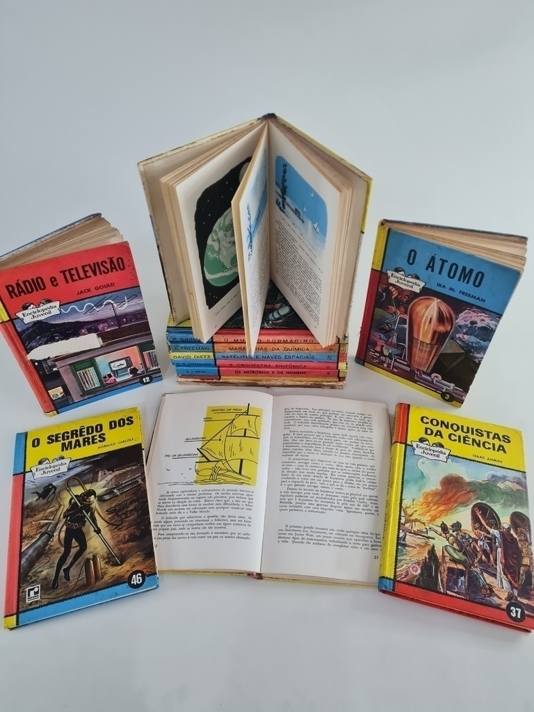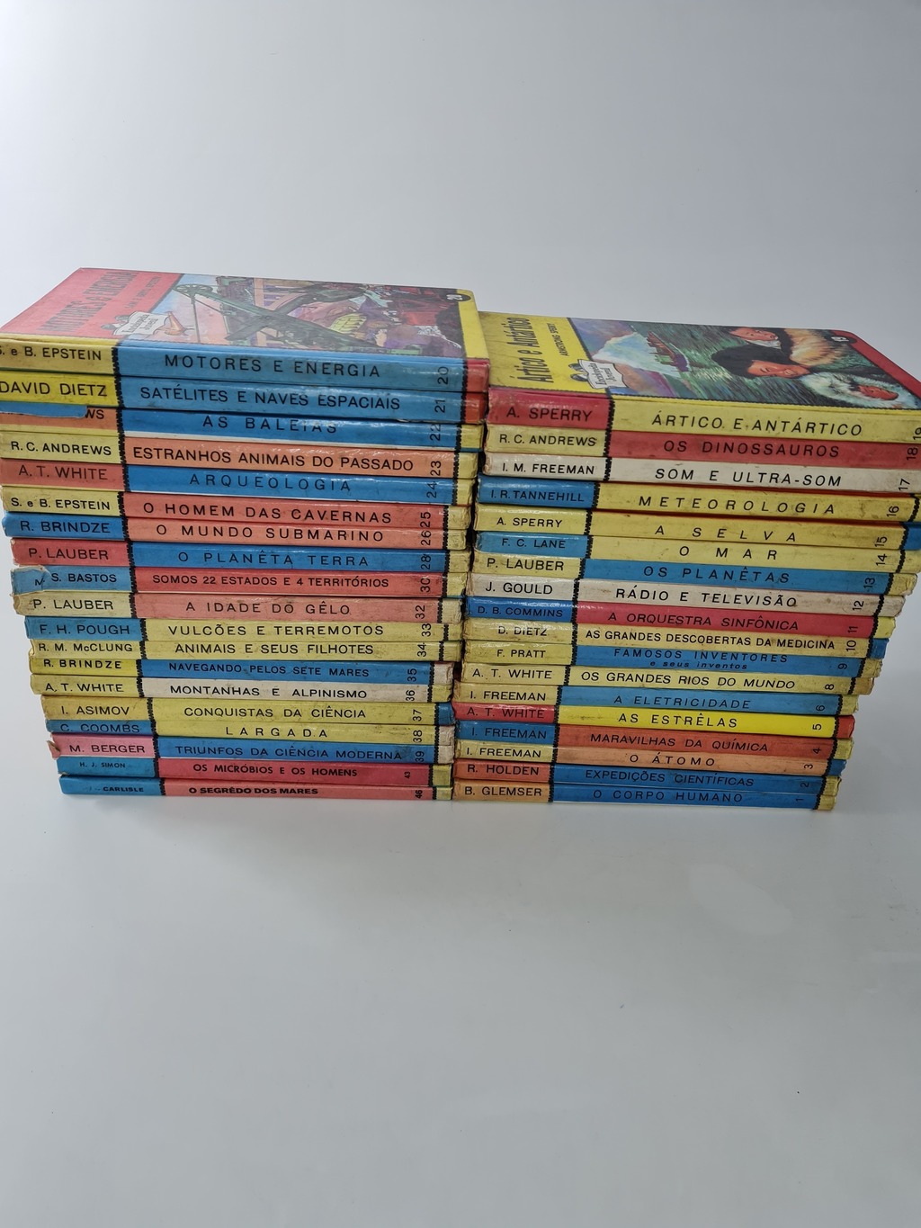 Assuntos palpitantes, Científicos e de Cultura Geral, tratados por autoridade na matéria em linguagem simples e clara, que certamente estimularão a curiosidade da juventude brasileira. Títulos inclusos nesse anúncio: O Corpo Humano (1); Expedições Científicas (2); O Átomo (3); Maravilhas da Química (4); As Estrelas (5); A Eletrecidade (6); Os Grandes Rios do Mundo; Famosos Inventores e seus inventos (9); As Grandes Descobertas da Medicina (10); A Orquestra Sinfônica (11); Rádio e Televisão (12); Os Planêtas (13); O Mar (14); A Selva (15); Meteorologia (16); Som e Ultra-som (17); Os Dinossauros (18); Ártico e Antártico (19); Motores e Energia (20); Satélites e Naves Espaciais (21); As Baleias (22); Estranhos Animais do Passado (23); Arqueologia (24); O Homem das Cavernas (25); O Mundo Submarino (26); O Planêta Terra (28); Somos 22 Estados e 4 Territórios (30); A Idade do Gêlo (32); Vulcões e Terremotos (33); Animais e seus Filhotes (34); Navegando Pelos Sete Mares (35); Montanhas e Alpinismo (36); Conquistas da Ciência (37); Largada (38); Triunfos da Ciência Moderna (39); Os Micróbios e os Homens (43); O Segredo dos Mares (46).