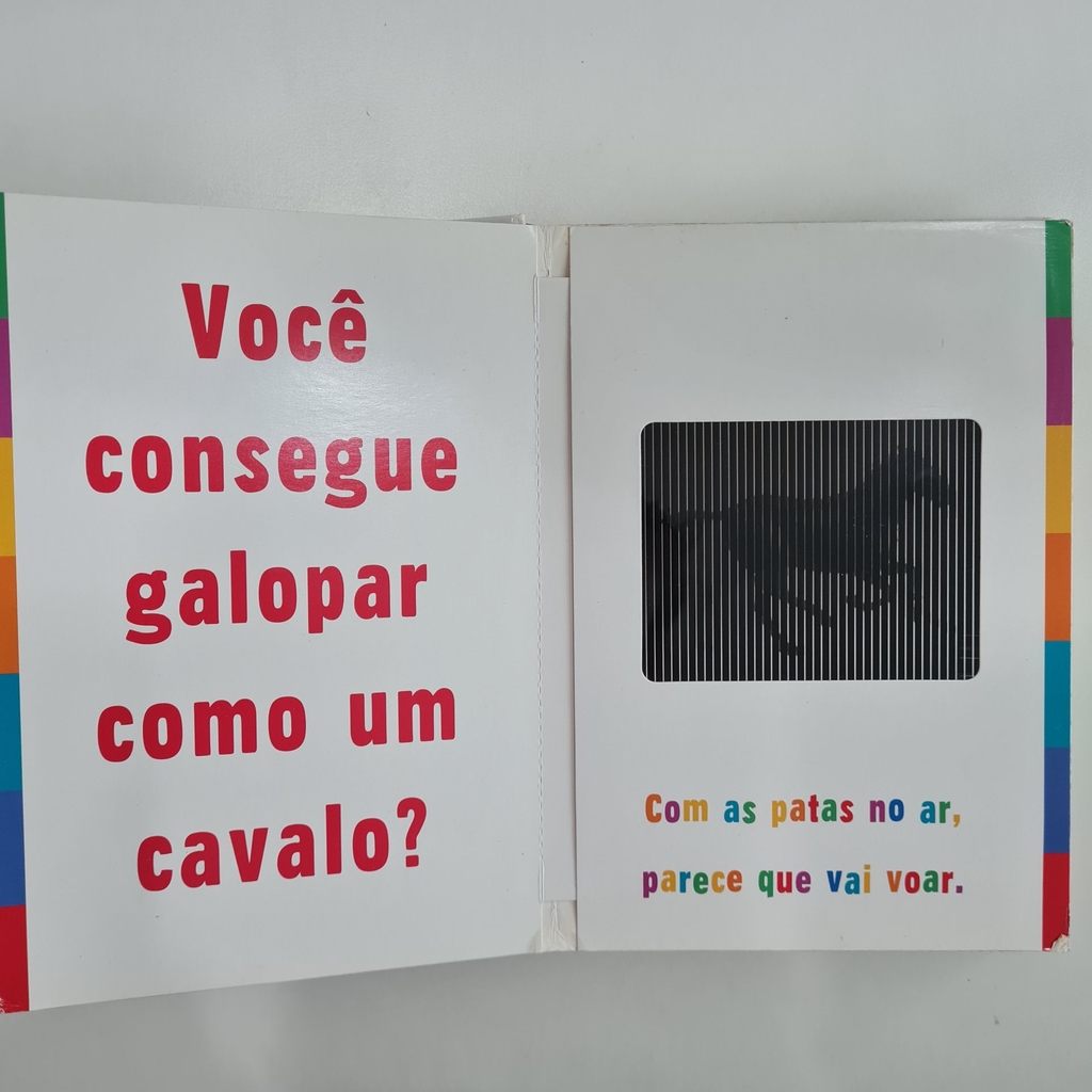 Abra este livro e veja os animais se moverem. Artista óptico, Seder utilizou a técnica do Scanimation para insinuar o movimento das personagens de seus livros conforme as páginas se abrem. Essa técnica é patenteada pelo próprio autor, que tem como base a técnica do kineticard, de 1997. A palavra de ordem do mundo em que vivemos atualmente, com o advento da globalização, é a velocidade: velocidade de transmissão de imagens, de textos, de programas de televisão. Pode-se saber o que acontece em qualquer lugar do mundo em questão de segundos, bastando o clique de um mouse para que ocorra a disseminação de qualquer tipo de notícia. Essa rapidez e facilidade de transmissão, no entanto, traz consigo alguns problemas. Todos os dias somos bombardeados com novas tecnologias, imagens, músicas, informações. Não somente os adultos, mas também as crianças sofrem do mesmo mal, tornando assim cada vez mais difícil agradá-las. Com essa grande quantidade de informações novas às quais as crianças estão expostas todos os dias, as mídias que as têm como público-alvo não poderiam ficar paradas no tempo. Como disse Guto Lins (designer e autor de livros infantis), em seu livro Livro Infantil ? Projeto Gráfico Metodologia Subjetividade, o tempo do livro infantil bonitinho, bem acabadinho acabou. Tendo isso em vista, um autor que não parou no tempo foi Rufus Butler Seder, com o livro Galope!, publicado pela Editora Sextante no Brasil. Artista óptico, Seder utilizou a técnica do Scanimation para insinuar o movimento das personagens de seus livros conforme as páginas se abrem. Essa técnica é patenteada pelo próprio autor, que tem como base a técnica do kineticard, de 1997. A ilusão de movimento nas páginas se dá através do deslize entre o cartão de papel no qual estão desenhados os frames da animação e a lâmina de plástico em que finas tiras pretas são impressas. Através do fino ajuste do movimento das tiras e da imagem impressa no cartão, é possível ter a impressão de que a personagem impressa está se movendo, divertindo o leitor.