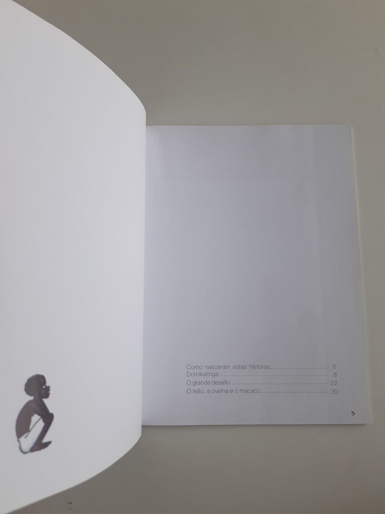 O livro traz algumas das narrativas que ilustram a cultura do povo africano colhidas pelos autores em viagem à capital de Angola: o conto Domikalinga fala sobre uma mulher grávida que promete doar seu bebê a quem lhe ajudar a buscar água na fonte. Em O grande desafio, um dono de terras que promete a mão da filha em casamento ao homem ou animal que conseguir pegar uma folha no alto da árvore mais alta do lugar. E a fábula O leão, a ovelha e o macaco traz uma metáfora sobre as possibilidades de ações humanas diante da malícia de pessoas falsas, que camuflam a má intenção em atitudes que podem parecer boas e inocentes.