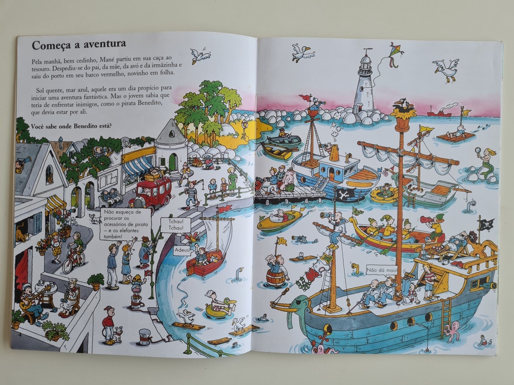 Mané, um jovem aspirante a pirata, percorre uma trilha fantástica, cheia de obstáculos e perigos, para ir em busca de um tesouro. Ao explorar a ilha, ele atravessa pontes, cruza lagos e sobe em vulcões. Há inúmeras outras atrações a serem descobertas pelo caminho, como encontrar os elefantes cor-de-rosa e não perder de vista Benedito e sua cobra de estimação. Essa história divertida propõe desafios que estimulam a curiosidade infantil, auxiliando no desenvolvimento da observação, da memorização e do raciocínio lógico.