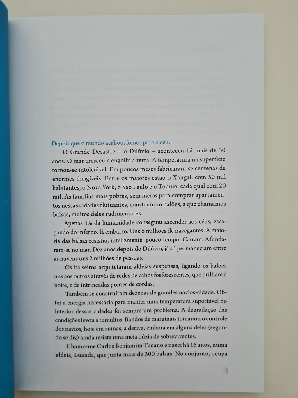 Após o Dilúvio causado pelo aquecimento global os sobreviventes construíram sociedades flutuantes. Entre as maiores cidades estão os dirigíveis São Paulo, Tóquio e Nova York. As cidades menores e mais pobres se organizaram em balões, formando aldeias. Quem nos conduz na história é Carlos, um adolescente angolano de 16 anos. Ele vive em Luanda, um conjunto de balsas que escolheu como negócio os livros, tornando-se uma aldeia biblioteca.