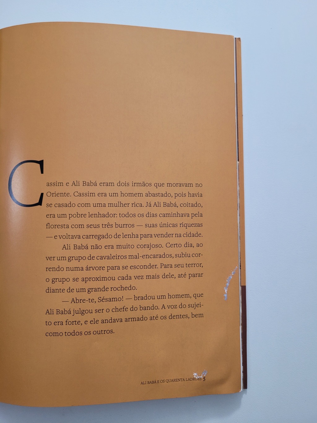 Há muito tempo, no Oriente, vivia Ali Babá, um pobre lenhador. Uma tarde, a caminho de casa, viu, sem que o percebessem, quarenta homens carregando grandes caixas para dentro de uma caverna secreta, escondida atrás de uma rocha. Depois que os homens partiram, Ali Babá foi até a rocha e disse as palavras mágicas que escutou do chefe dos bandidos: “Abre-se, Sésamo”. Sua grande aventura estava apenas começando.