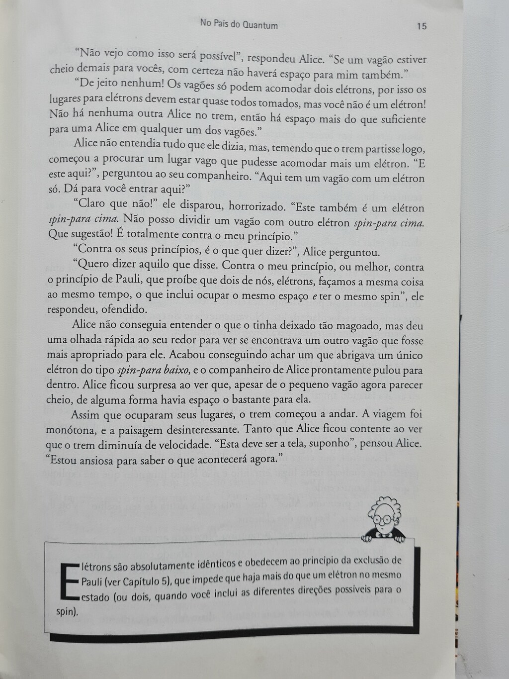 Depressa, depressa, depressa! Deem o primeiro passo! Bem-vindos ao País do Quantum! Penetrem no átomo e espiem os elétrons! Apreciem o bizarro Imperador pensar suas roupas e materializá-las! Dancem com os Tres Irmãos Quarks no baile Massacarado das Partículas! Tudo o que voce precisa é espírito de aventura- a matemática é dispensável!