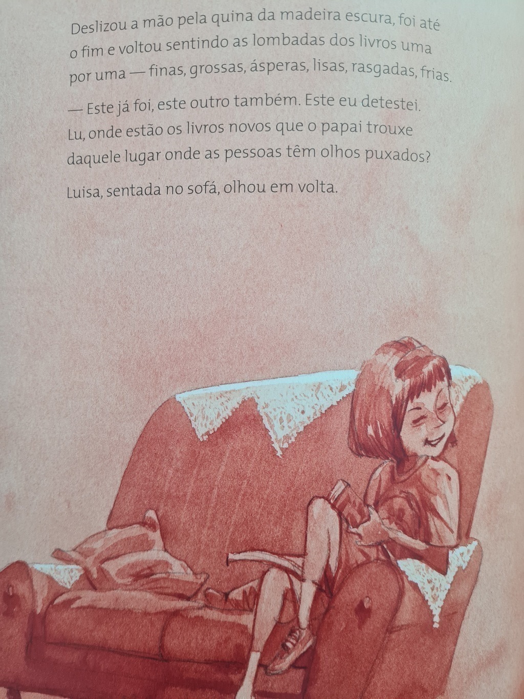 Luisa e o irmão Tiago inventaram um jogo com uma regra simples: abriam um livro ao acaso, se caísse numa página com texto, ela o lia para ele, se fosse imagem, ela teria que descrevê-la e explicá-la apenas com palavras. Por muitos anos eles se divertiram e se emocionaram com esse jogo. Foi assim que Luisa começou a inventar Histórias e foi assim que iluminou o mundo de Tiago. Texto e ilustrações de Eva Furnari.