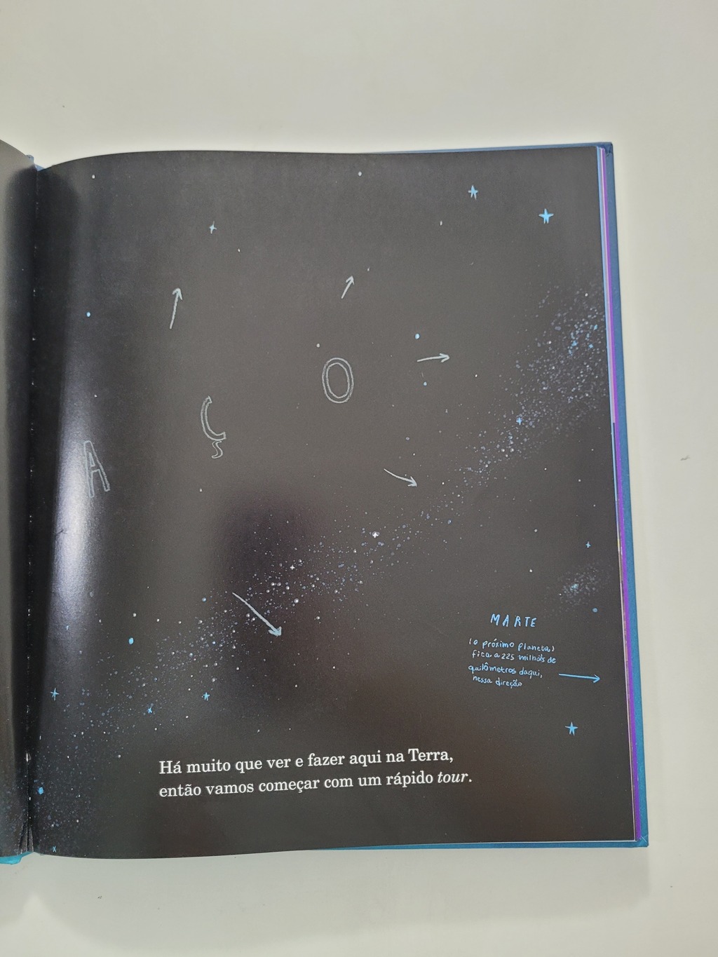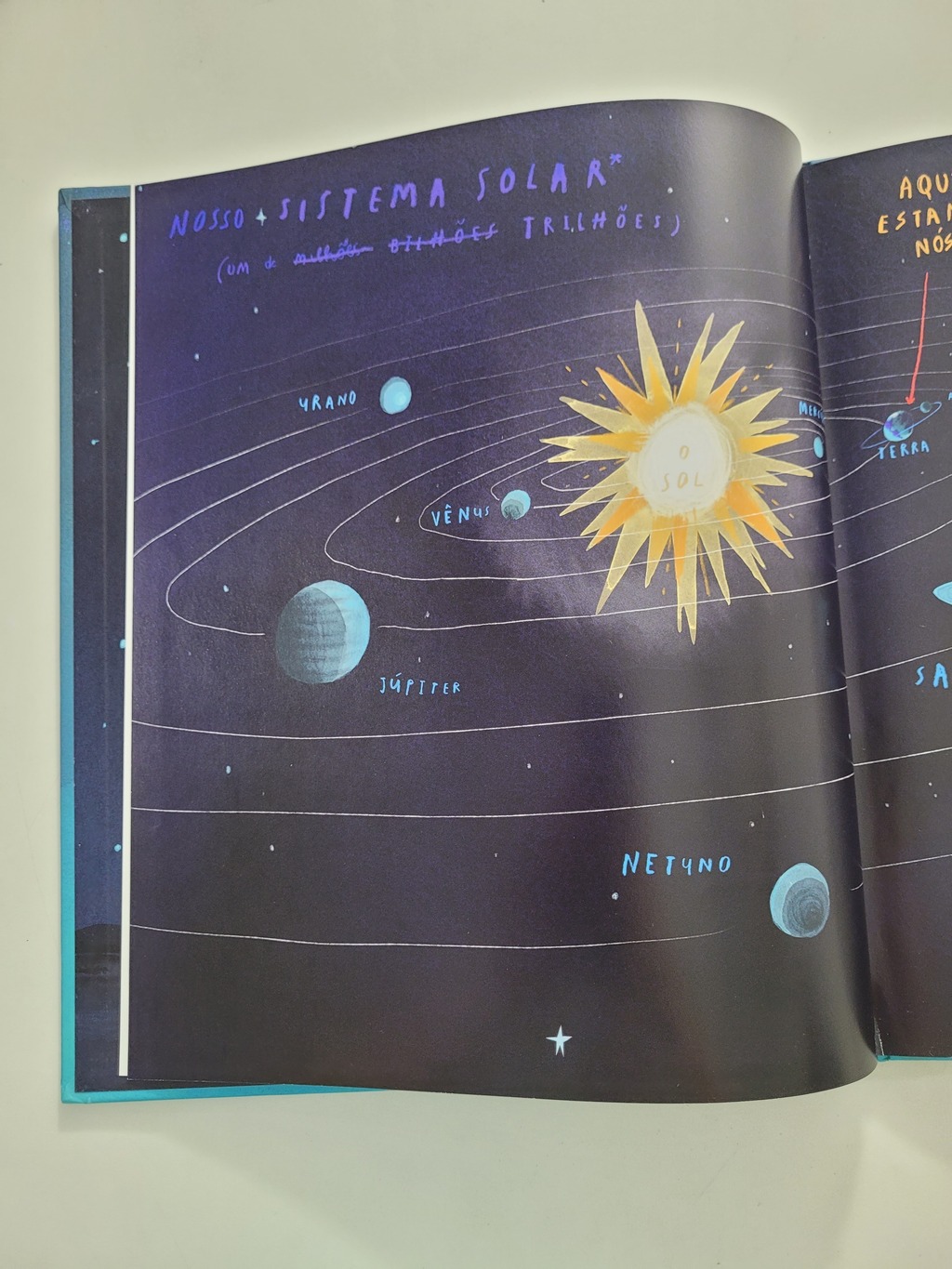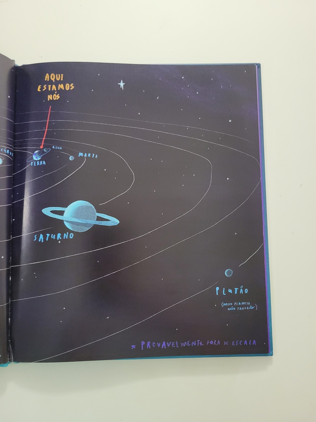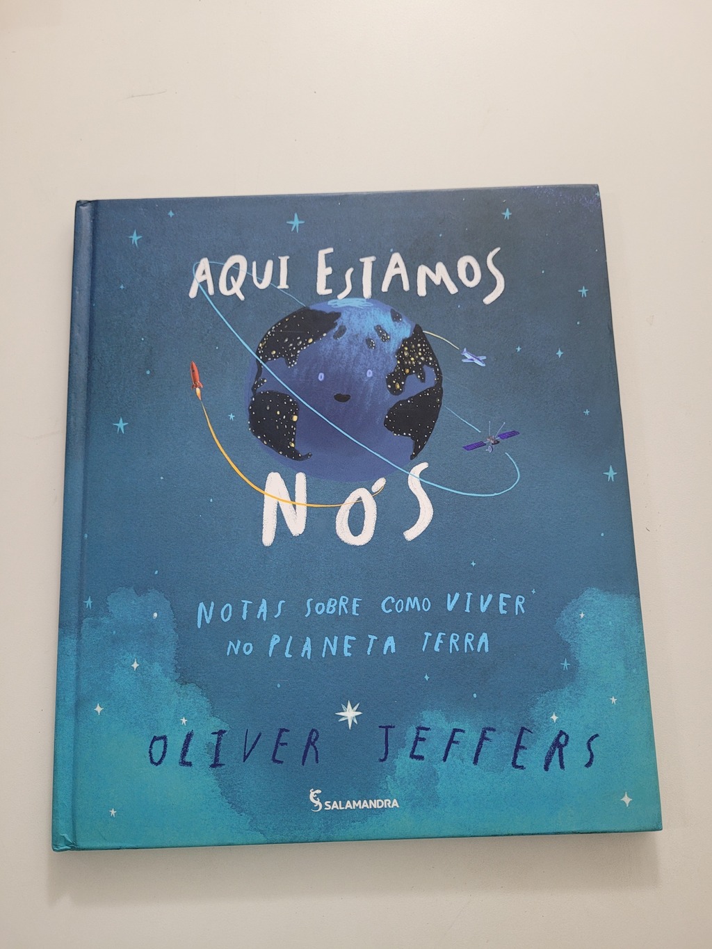 Em Aqui estamos nós, Oliver Jeffers nos convida a refletir sobre o imenso planeta que nos acolhe e, principalmente, sobre a vida que levamos nele. Assumindo a voz de um pai que está conversando com seu filho recém-nascido, situação real que inspirou a escrita do livro, o autor gentilmente nos apresenta o planeta sob diversos pontos de vista. Assim, com pequenos conselhos que valorizam a vida, o carinhoso pai repassa ao filho singelas e divertidas lições de sobrevivência na Terra. E, entre tantas importantes reflexões, uma delas com certeza ficará mais forte na mente do jovem leitor: não estamos sozinhos aqui. Como uma gota no oceano, somos apenas um entre os bilhões de seres vivos que vivem sobre a Terra. Assim, fica fácil compreender por que partilhar, tolerar e respeitar são verbos fundamentais para o nosso manual de sobrevivência!