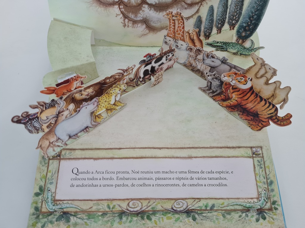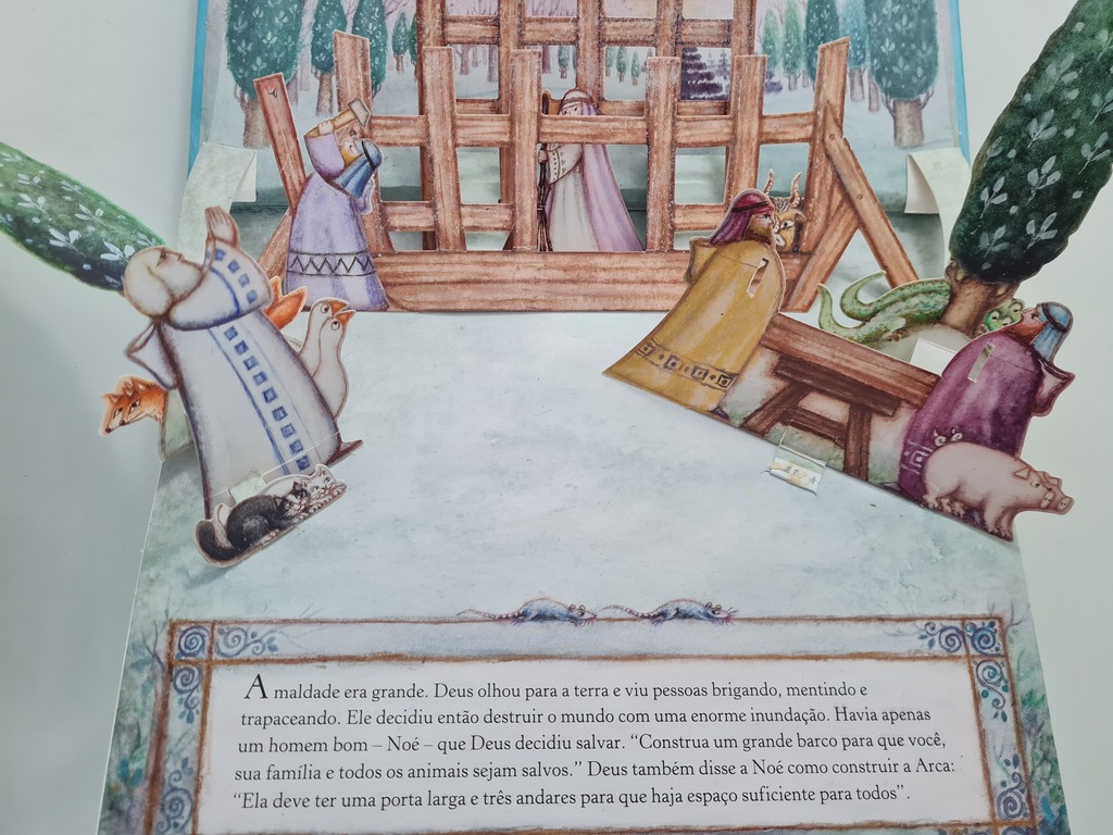 Este livro traz seis ilustrações tridimensionais do relato da Arca de Noé. As páginas tem recursos interativos, para puxar, abrir e mexer, que encantam a todos. No final, enquanto os animais desembarcam da Arca, de dois em dois, surge um lindo arco-íris.