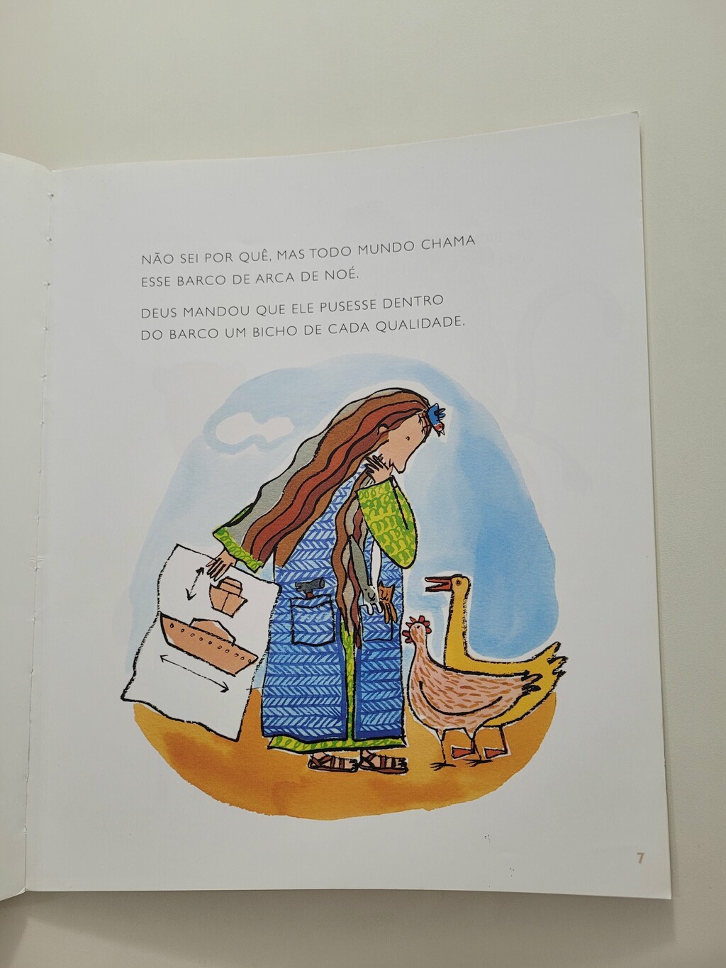 Um dia Deus chamou um homem chamado Noé e pediu que ele construísse um barco enorme ? que todo mundo chama de Arca de Noé ? e botasse dentro dele um casal de cada tipo de bicho. Noé fez tudo direitinho. Tinha de tudo dentro do barco: leão e leoa, cachorro e cachorra, gato e gata Tinha peru, tinha pato. Tinha vespa e carrapato. Avestruz, carneiro, pinto Tinha até ornitorrinco. Um dia choveu tão forte que não dá nem para imaginar. Mas imaginem… O mundo ficou todo coberto de água. Será que a Arca de Noé afundou junto com todo o resto ou permaneceu na superfície das águas e salvou os animais? Recriação da história bíblica, A arca de Noé da Ruth Rocha encanta pela linguagem ao mesmo tempo poética e coloquial ? traços que os desenhos de Mariana Massarani souberam captar tão bem.