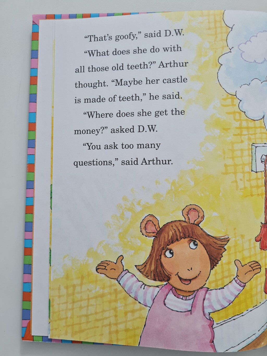 D.W. is jealous when her big brother Arthur loses a tooth and gets a visit from the Tooth Fairy.Arthur explains that the Tooth Fairy comes only when you lose a tooth and put it under your pillow at night, so D.W. dreams up some hysterical (but unsuccessful) plans to trick her into coming.Finally, Arthur decides to reward D.W.’s efforts by playing Tooth Fairy himself!By matching picture stickers to words in the story, kids reinforce word recognition.With the extra stickers, they can create stories of their own.”