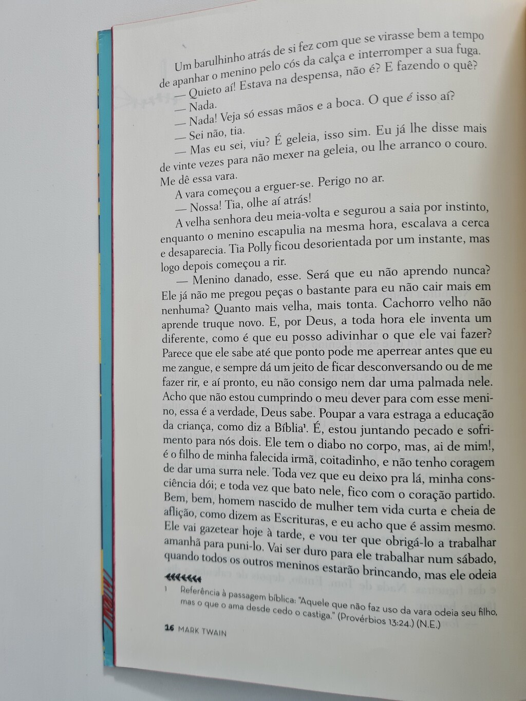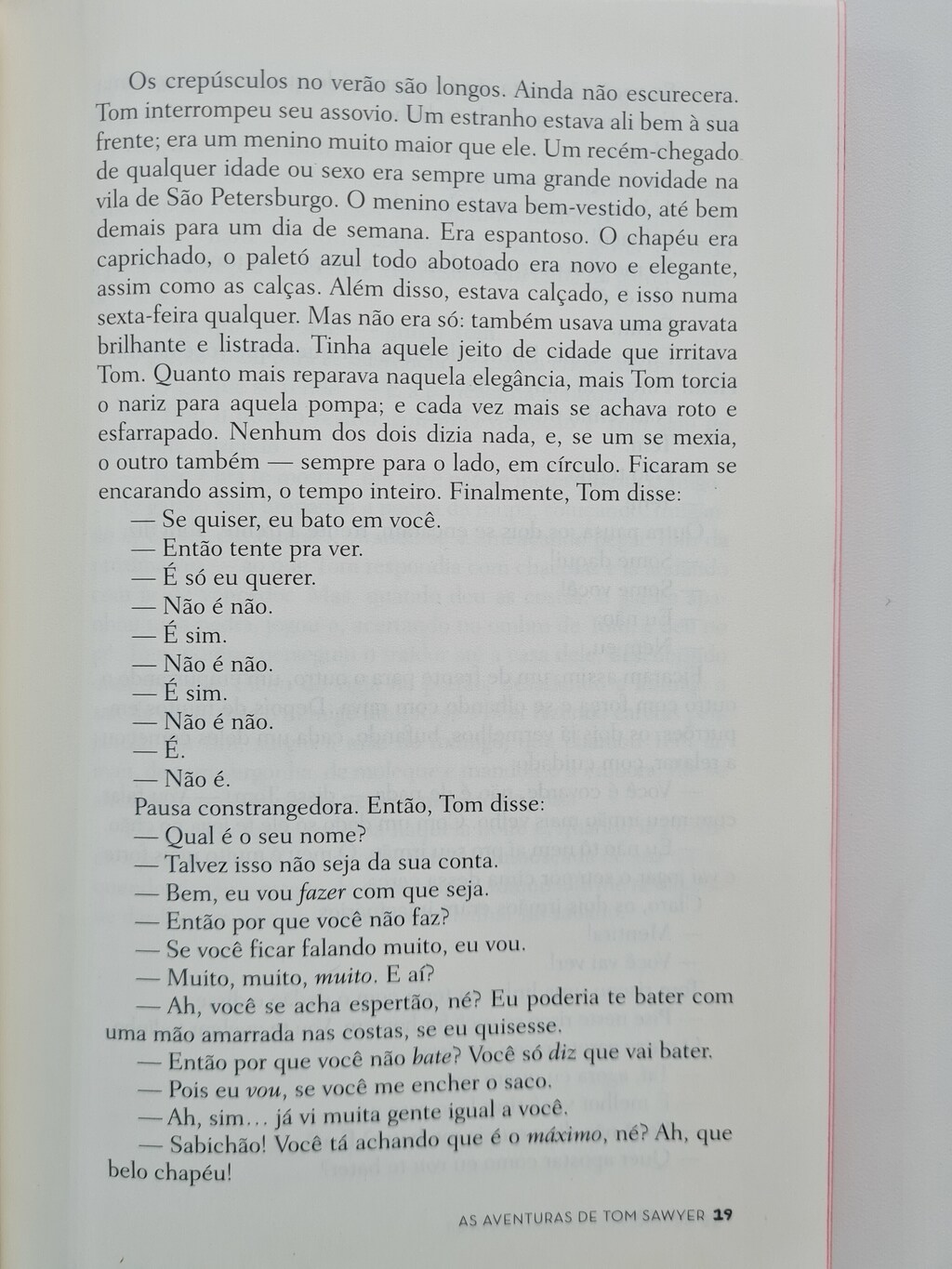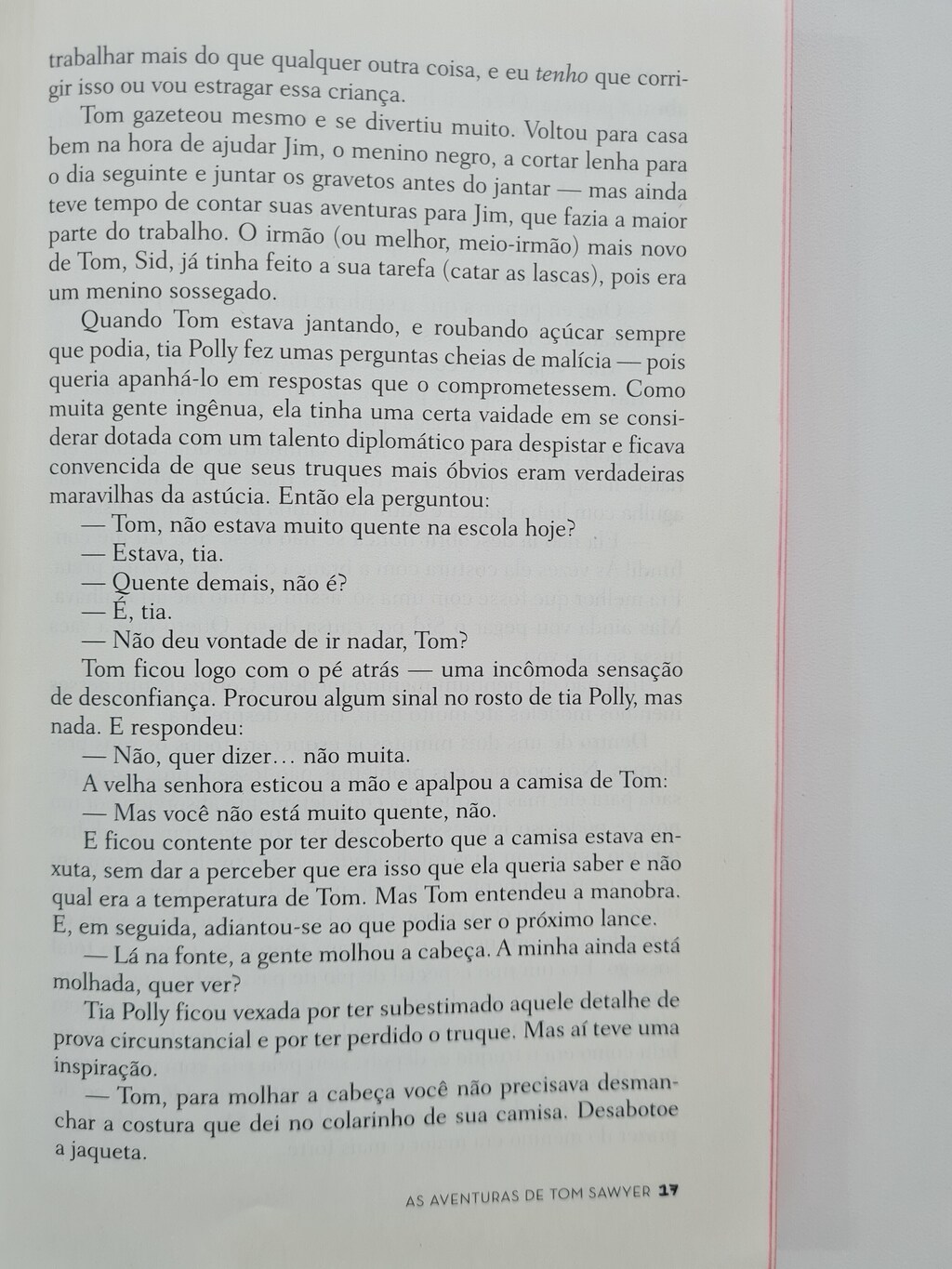 Tom, menino órfão que mora com a tia, tem a irreverência própria de sua idade, no limite entre a infância e a adolescência. Para escapar das aulas e das encrencas que arruma, o garoto cria as mais inusitadas aventuras, nas quais impera a fantasia. É numa pequena cidade às margens do Mississipi, em meados do século XIX, que Mark Twain faz brilhar um dos mais celebrados personagens da literatura norte-americana, adorado por uma infinidade de jovens leitores. Através dos olhos ingênuos – mas astutos – do protagonista, o autor constrói um romance de formação, que denuncia a hipocrisia e o preconceito da sociedade, sem deixar de lado a ternura.