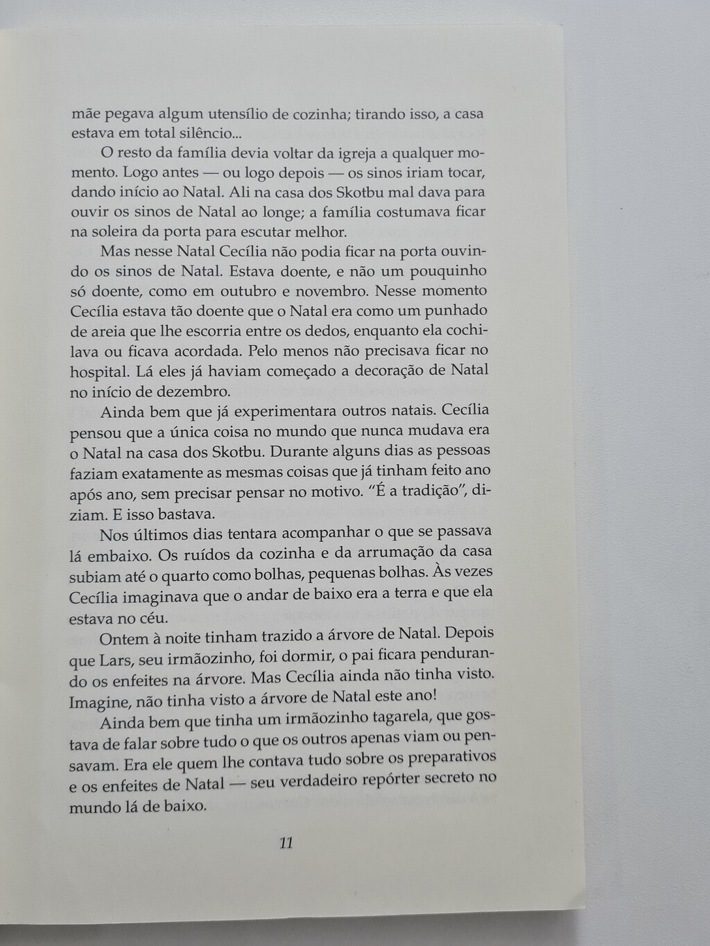 Cecília passa quase o tempo todo em seu quarto, deitada na cama. Ela está muito doente, e sua cabeça não tem cura. Mas ela não está sozinha enquanto celebra o Natal com sua família. A garota pode escrever todos seus pensamentos em seu diário secreto e contar com a companhia de um amigo inusitado que um dia aparece em seu quarto, do nada.