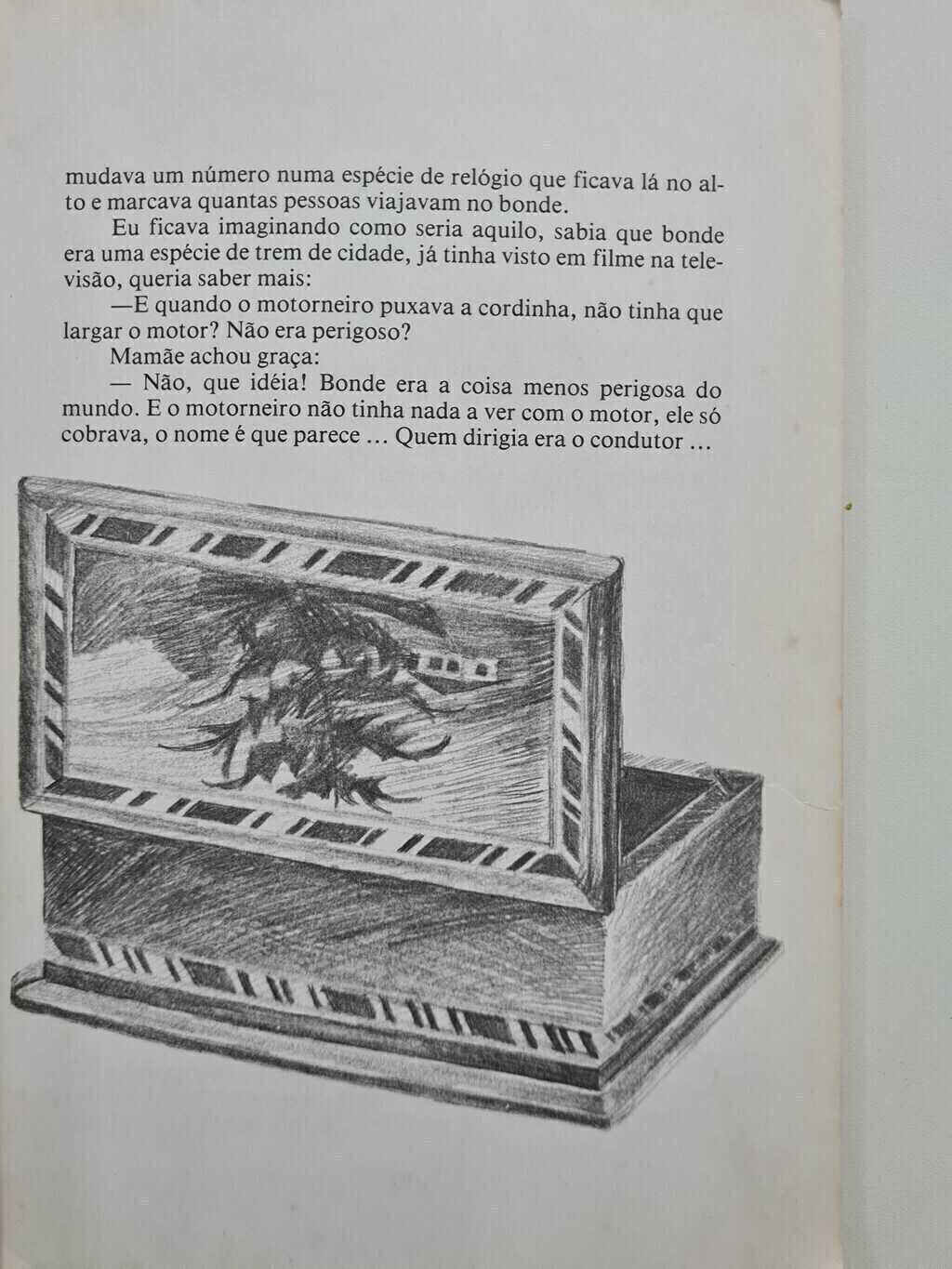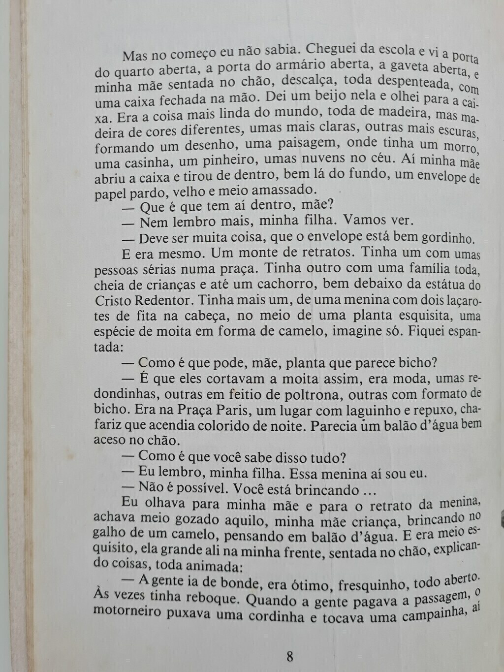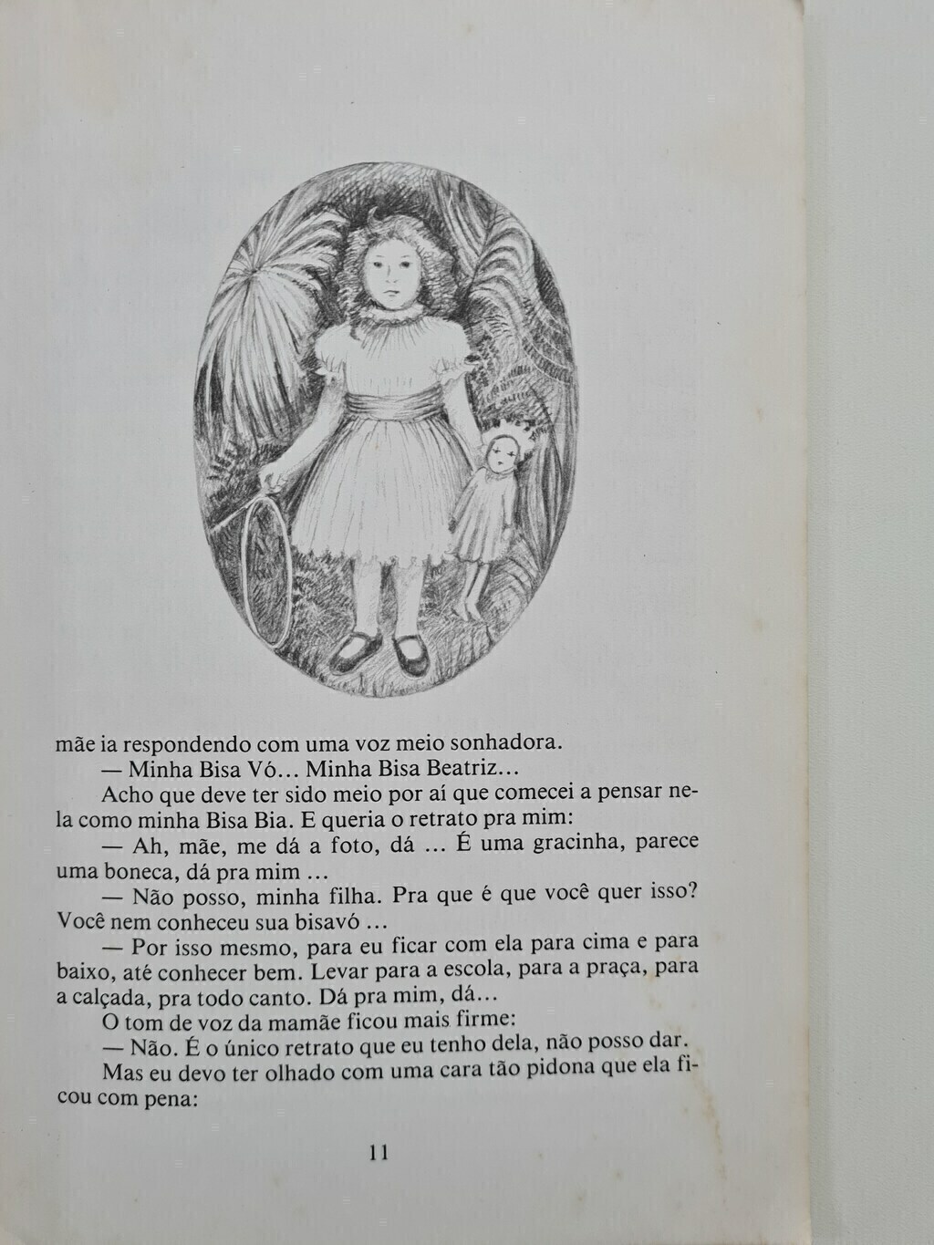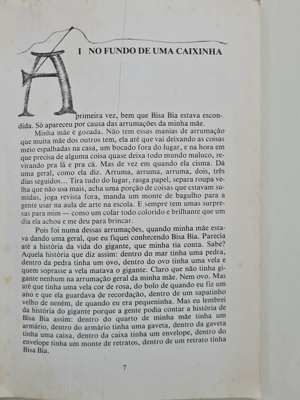 Sabe? Vou lhe contar uma coisa que é segredo. Ninguém desfia. É que Bisa Bia mora comigo. Mínguem sabe mesmo. Nínguem consegue ver. Pode procurar pela casa inteira, duvido que ache. Mesmo se alguém for bisbilhotar num cantinho da gaveta, não vai encontrar. Nem fuçar debaixo do tapete. Nem atrás da porta. Se quiser, pode até esperar uma hora em que eu esteja distraída e pode espiar pelo buraco da fechadura do meu quarto. Pensa que vai conseguir ver Bisa Bia? Vai nada… (LIVRO VINTAGE, 1990)