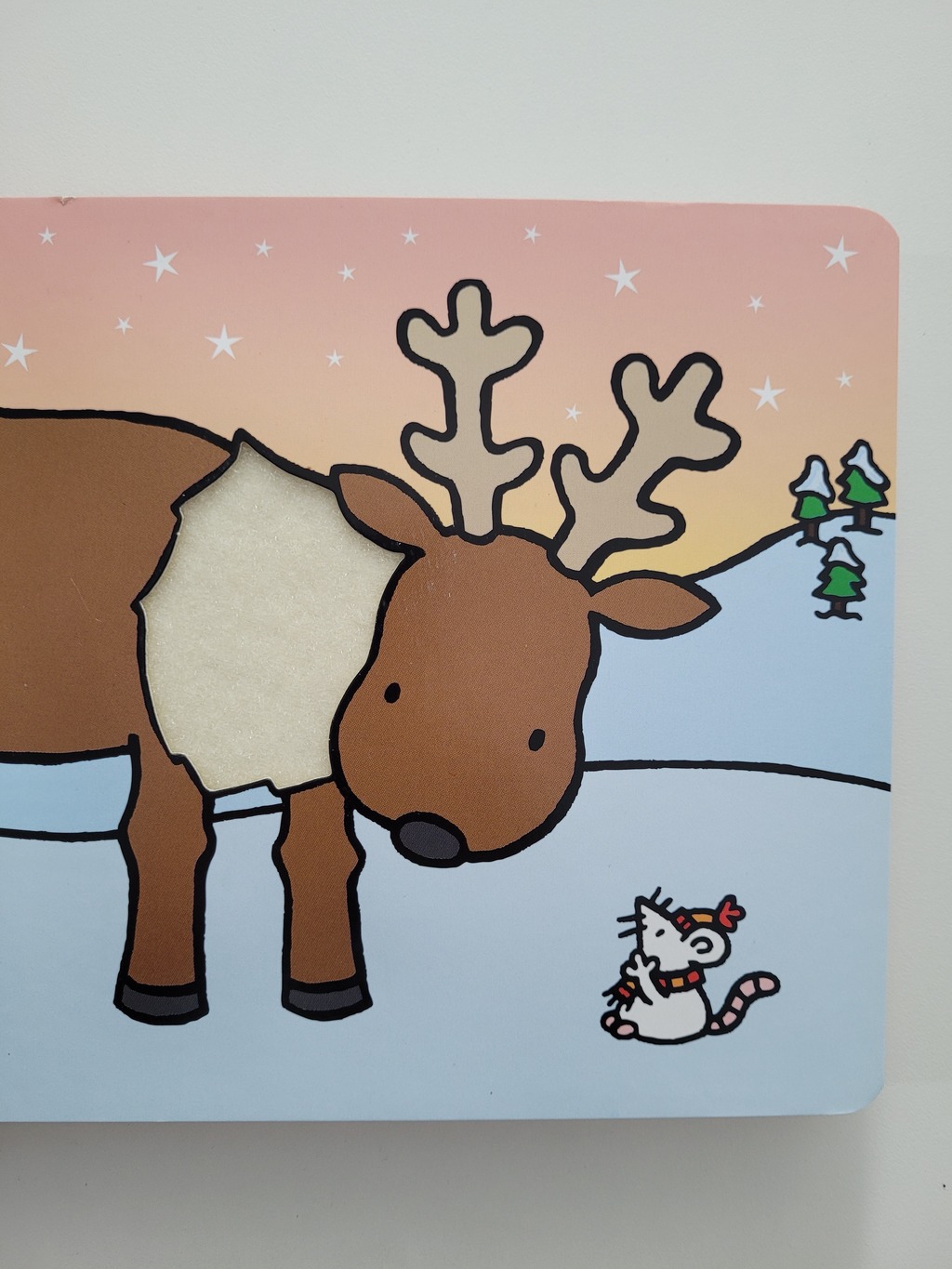 São cinco renas a serem encontradas nesse livro, com orelhas de veludo, pescoços macios e nariz vermelho brilhante, e uma rena de pelúcia para os bebês abraçarem enquanto escutam a leitura do livro.