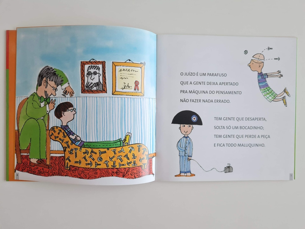 Os parafusos apertam bem apertadinho o juízo no lugar e impedem a cabeça de fazer pequenas – e grandes – confusões. Mas, nesse dia, o menino acordou sem o seu e já foi fazendo trapalhadas. Penteou o cabelo com a escova de dentes, passou manteiga na maçã, foi para a escola de pijamas e assistiu à aula de cabeça para baixo, imagine só! Onde será que foi parar o parafuso? O livro é todo rimado e cheio de repetições bem ao gosto dos pequenos leitores e ouvintes. As belas imagens de Mariana Massarani são um convite a mais diversão, que começa depois que Tino Freitas escreve o (primeiro) fim. Quem será que vai achar o juízo do menino?