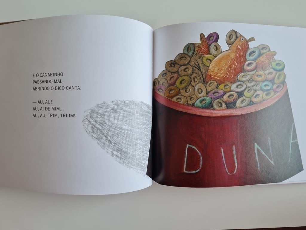 Quem vai à feira, perde a cadeira. Dona Elfrida arruma com capricho a comida de Duna na tigela, mas a cadelinha está cansada da ração… Quem sabe não encontra algo diferente na cozinha? Justamente nessa hora, lá no alto do telhado, pousa um canarinho. Vê a tigela, não há ninguém por perto, se aproxima. Dá uma bicada e que surpresa: como é deliciosa esta refeição! Para dividir prato tão gostoso, convida o pardal, o azulão e o periquito. Na geladeira de dona Elfrida, Duna só encontra legumes e verduras. O melhor a fazer é voltar para a ração. Mas será que sobrou algum grão? Por meio de jogos de sons e rimas, Sylvia Orthof constrói uma divertida trama para crianças em fase de alfabetização que envolve uma tigela de ração, uma cadela enjoada e um canarinho esfomeado.