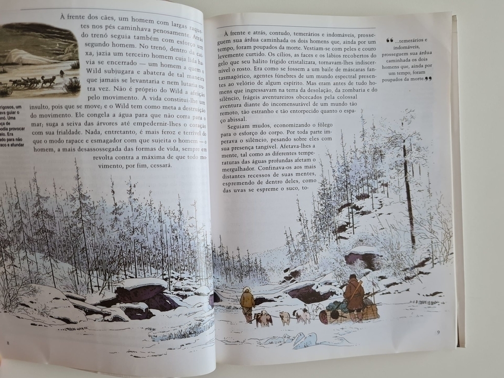 Nas suas ilustrações Philippe Munch conta a história de Caninos Brancos, o cão-lobo do Wild, que abandona a solidão gelada do extremo norte canadense para conhecer a civilização.