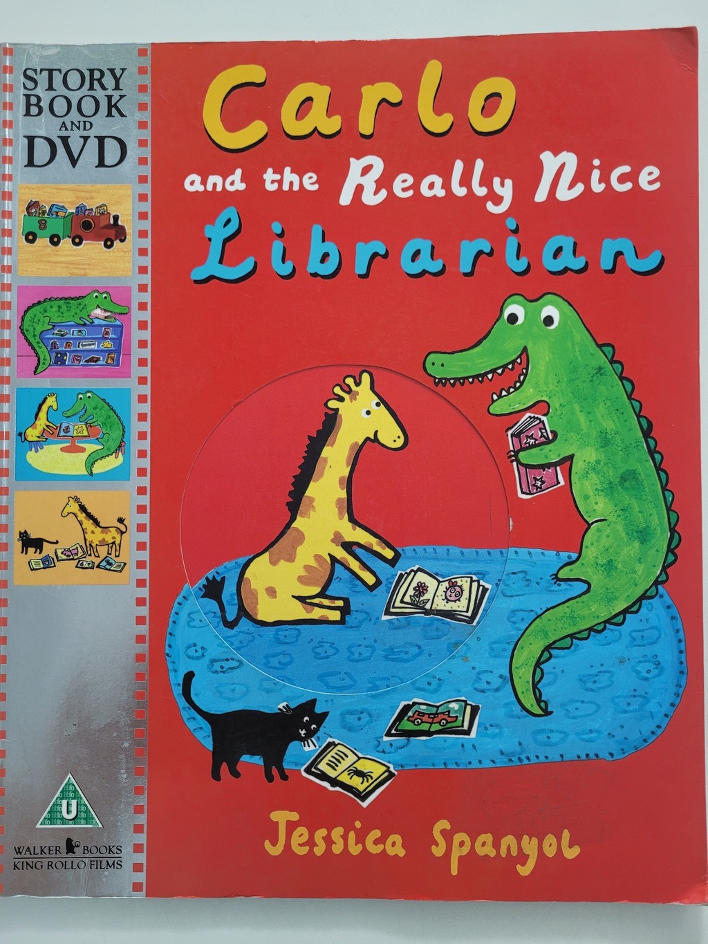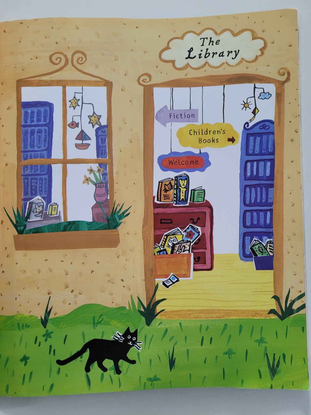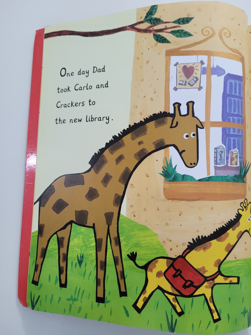 Carlo loves the new library, with its books and posters and chairs with wheels on.