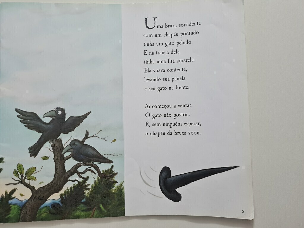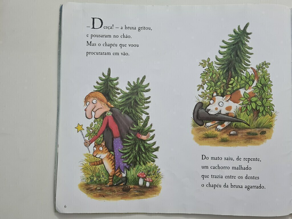 A bruxa e seu gato estavam muito felizes voando na vassoura, até que… O vento leva primeiro o chapéu da bruxa, depois seu laço e, por fim, a varinha! Felizmente, cada uma dessas coisas é apanhada por um animal prestativo que se junta á bruxa agradecida e a seu gato na viagem. Uma história muito engraçada sobre a bruxa e seus amigos, com rimas irresistíveis e ilustrações maravilhosas, é perfeita para ser lida em voz alta e apreciada pelas crianças.