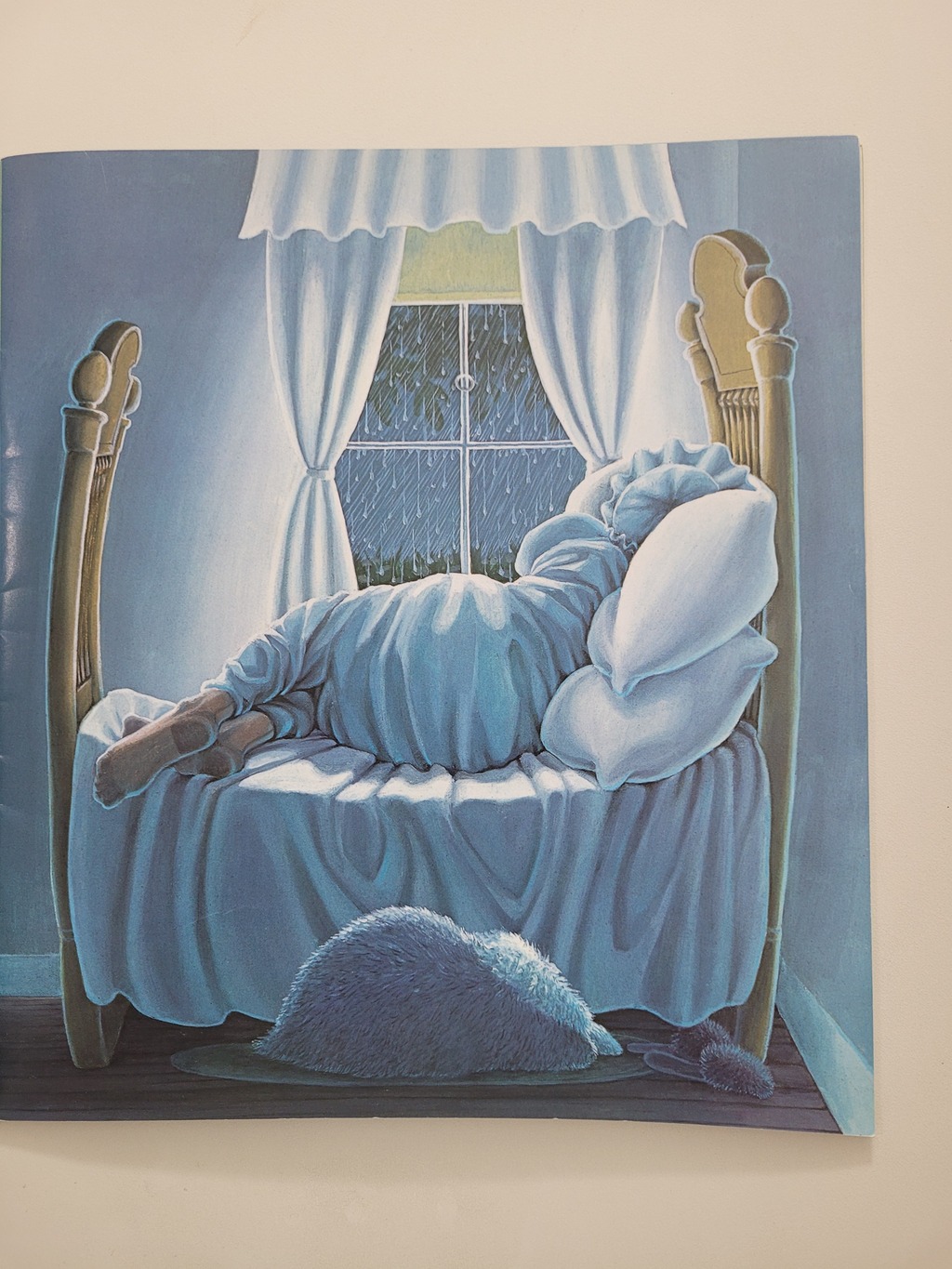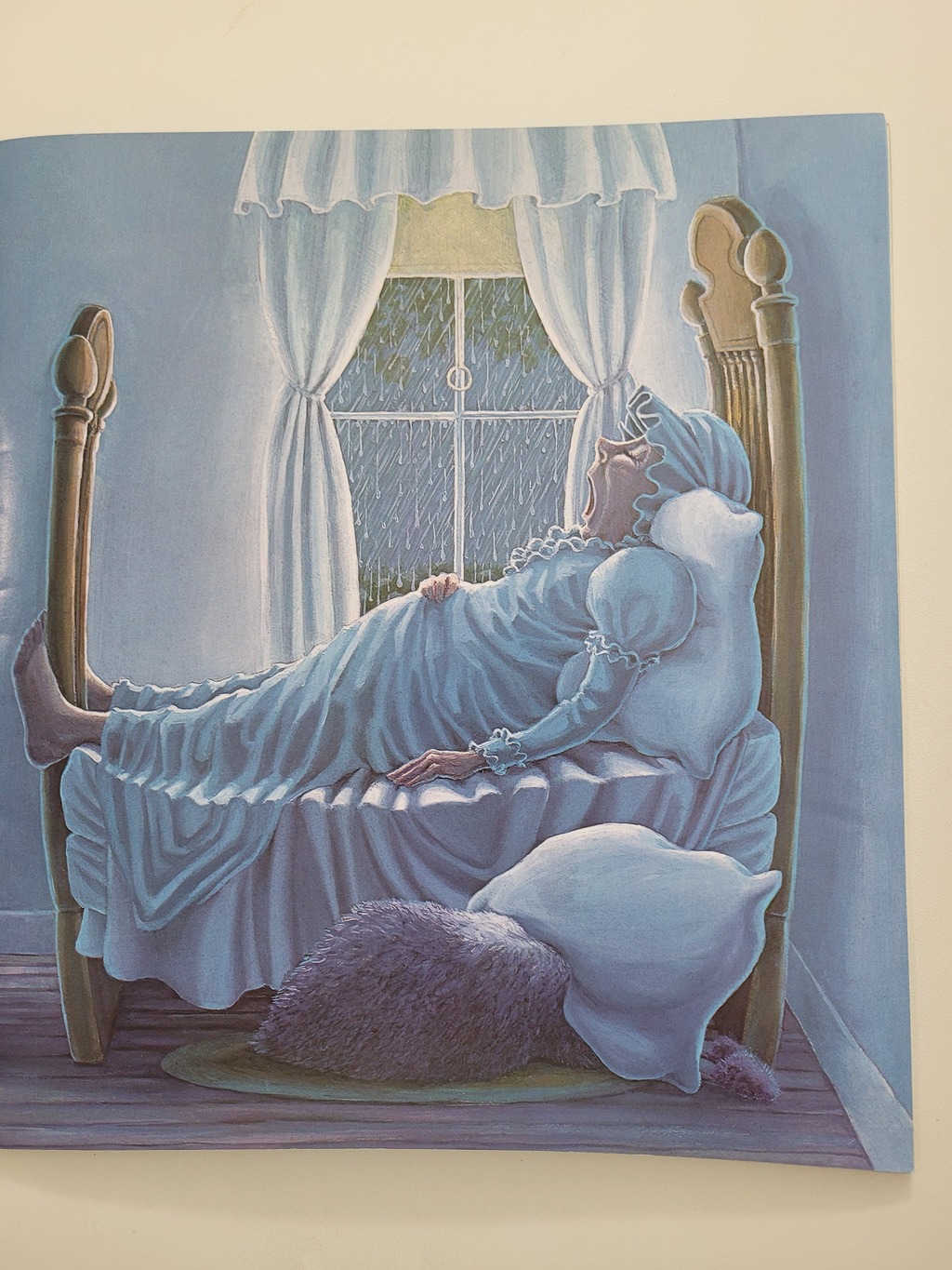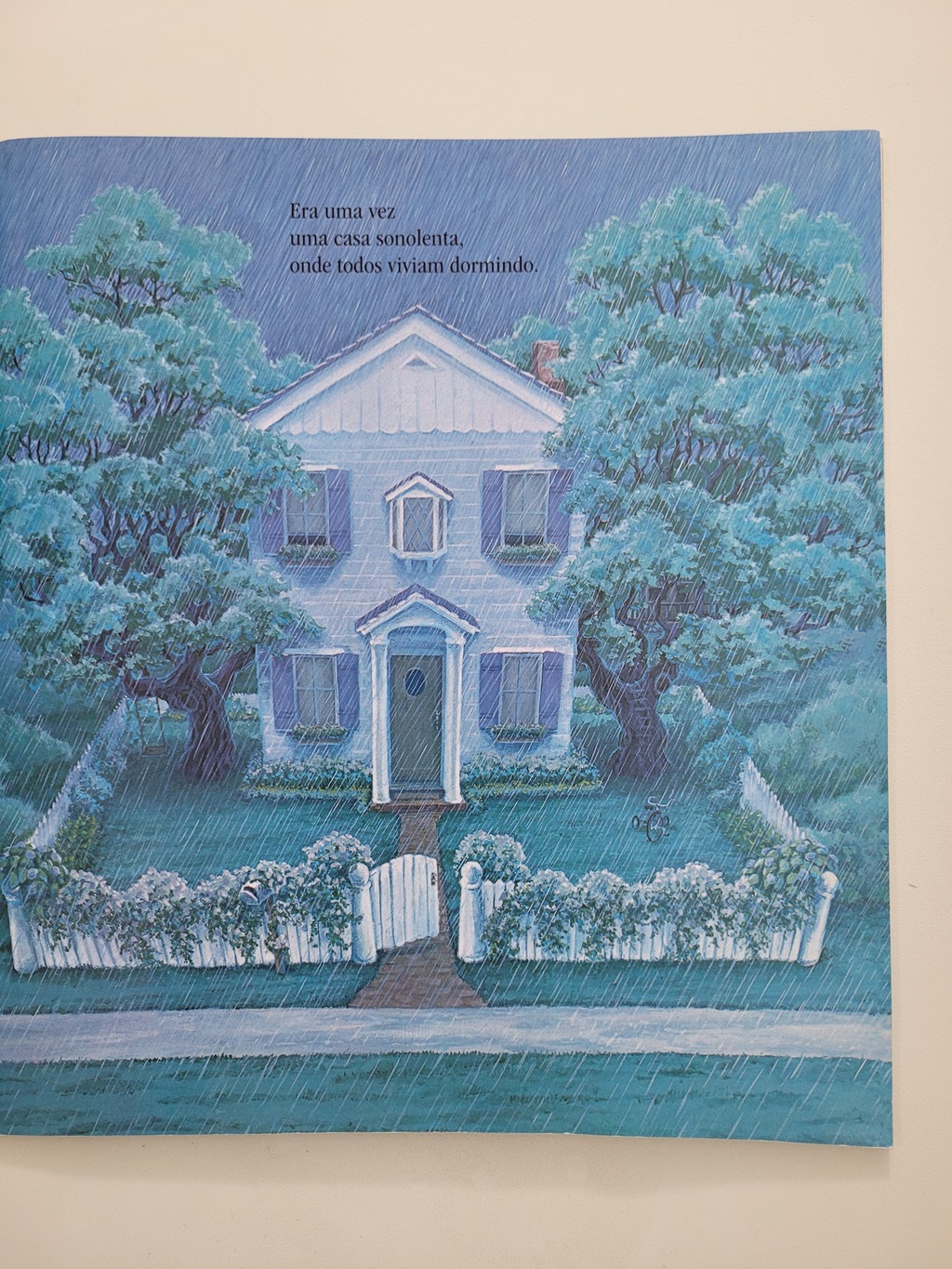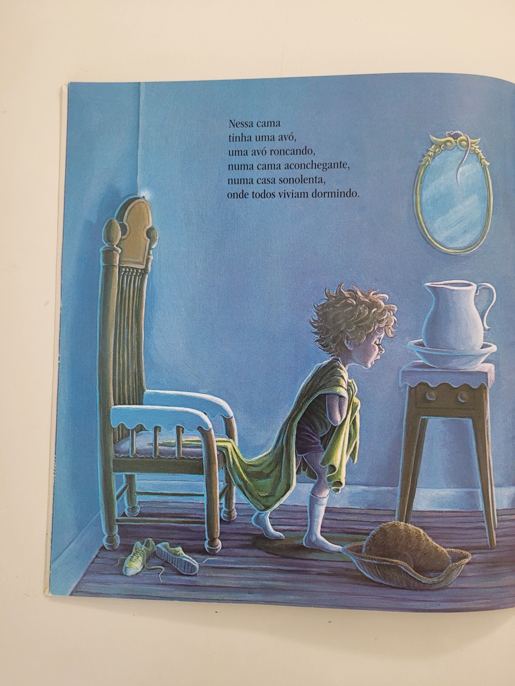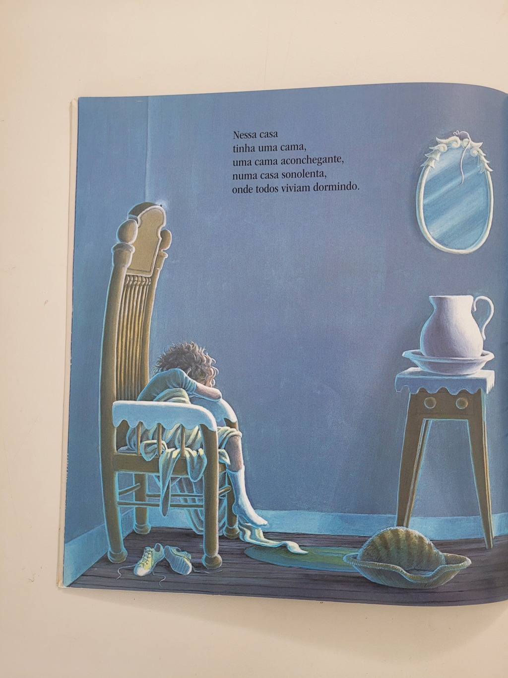 Numa casa sonolenta, com uma cama confortável, todos vivem dormindo. As repetições no texto dão o tom sonolento, que é interrompido por uma pulguinha acordada.