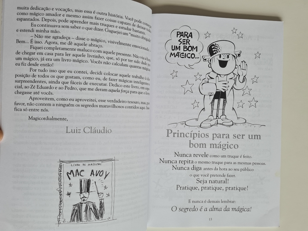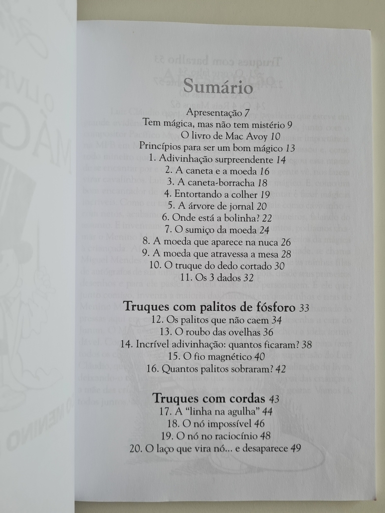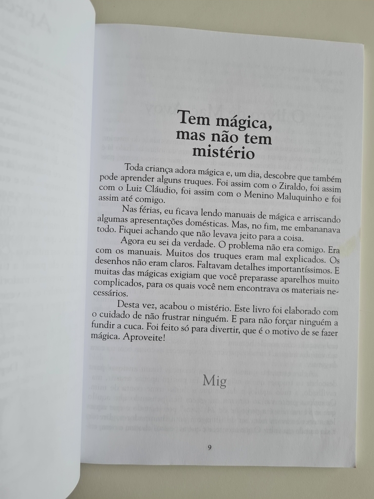 Toda criança adora mágica e, um dia, descobre que também pode aprender alguns truques. Foi assim com o Ziraldo, foi assim com o Luiz Cláudio, foi assim com o Mig e foi assim também com o Menino Maluquinho. Como em muitos manuais os truques são mal explicados e os desenhos, confusos, esses amigos decidiram se juntar e criar um livro reunindo todas as mágicas que aprenderam ao longo da vida. Elaborado de maneira descomplicada, este livro vai encantar crianças, pais, mães, avós, tios, a família toda. O único objetivo: divertir. Afinal, como lembra Mig, esse “é o motivo de se fazer mágica”. Aproveite!
