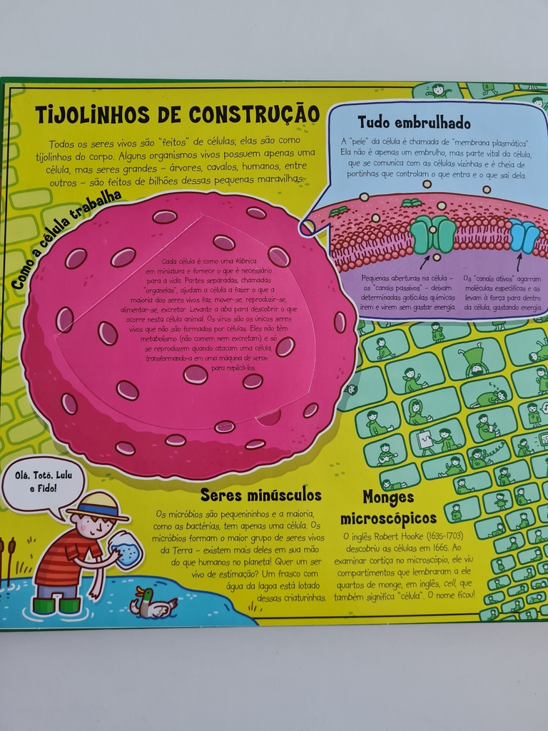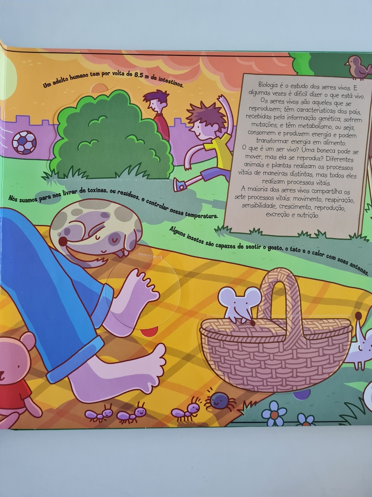 O que são os micróbios? Por que as plantas são verdes? Quantas vezes bate o coração humano durante a vida inteira? Aprender sobre o incrível universo da biologia se transforma em uma aventura divertida com O Genial Mundo da Ciência: Seres Vivos. O livro aborda, de maneira interativa, alguns dos principais temas desta matéria, como genética, anatomia, funcionamento do corpo humano, evolução das espécies e características das plantas. As ilustrações tridimensionais e as abas desdobráveis estimulam os pequenos a explorar cada canto das páginas do volume, descobrindo curiosidades sobre os assuntos abordados. A linguagem objetiva e os exemplos claros facilitam a compreensão de tópicos como o funcionamento das células, o crescimento e envelhecimento do homem, o processo de fotossíntese nos vegetais, as curiosas plantas carnívoras, o ciclo da cadeia alimentar, os sistemas circulatório e nervoso, o processo de duplicação do DNA e muitos outros assuntos instigantes.