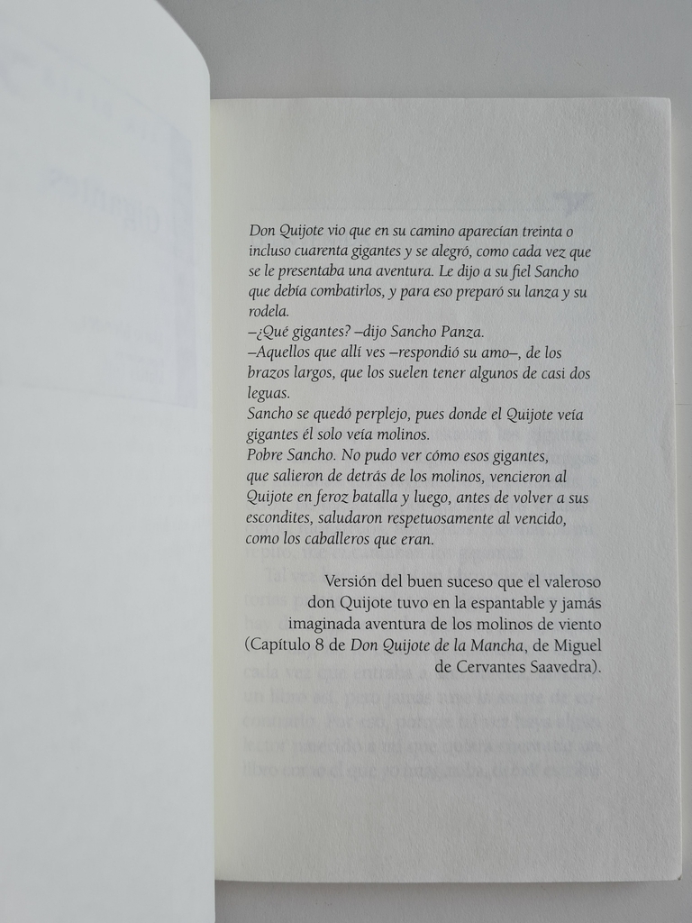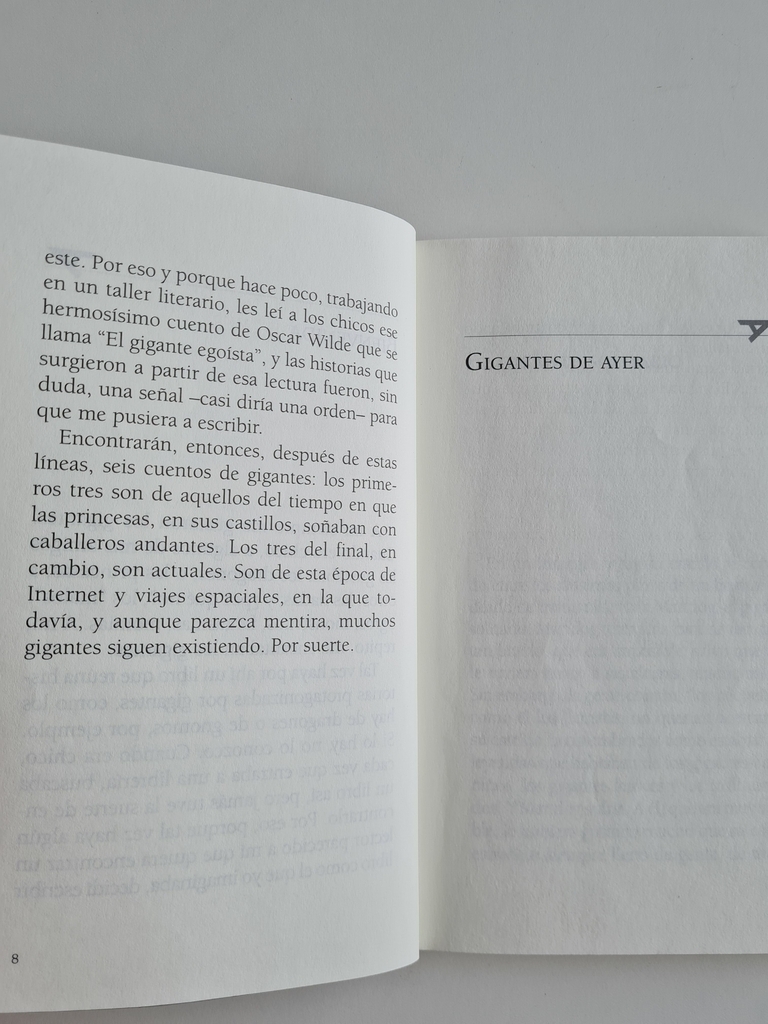 Este es un libro pensado a lo grande… porque sus protagonistas son gigantes. No solo tienen cuerpos enormes, sino que también sus corazones y sus sueños son profundos e inmensos. Los primeros tres cuentos narran las historias de gigantes de ayer, aquellos que vivian en castillos y se topaban con misteriosos caballeros andantes. Los otros tres tratan sobre gigantes de hoy, esos que, aunque parezca mentira, continúan existiendo y ahora viven entre edificios, computadoras y viajes espaciales.