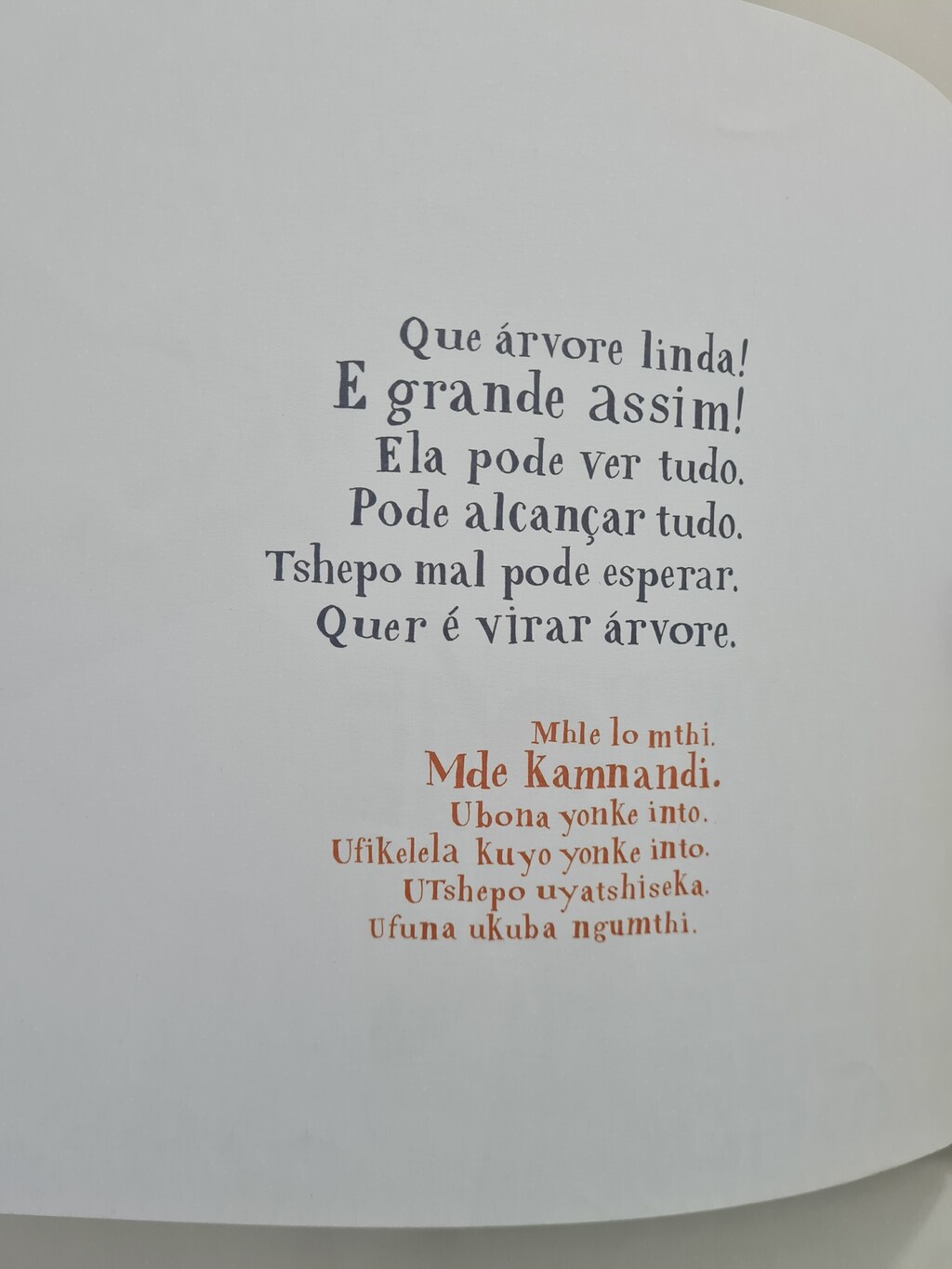 Que árvore linda! E grande assim! Ela pode ver tudo. Pode alcançar tudo. Tshepo mal pode esperar. Quer é virar árvore.