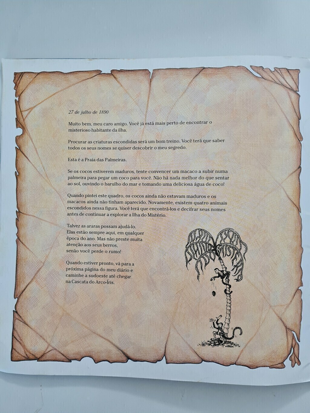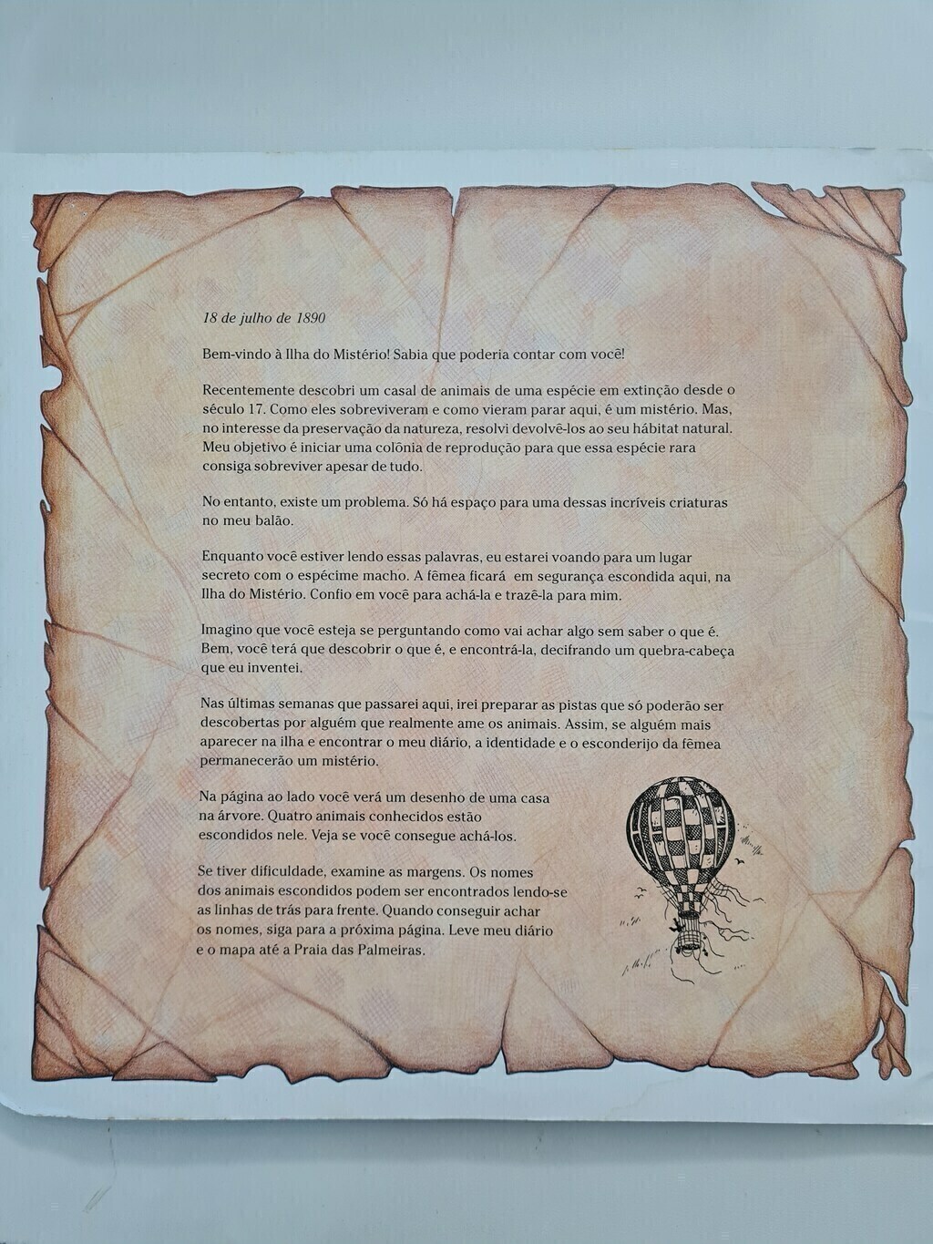 Caro amigo: Preciso urgentemente de sua ajuda. Venha logo á ilha do mistério e ajude-me a salvar da extinção a criatura mais rara que existe no mundo. Este livro é meu diário. Não o perca de vista. Se cair em mãos erradas, será um desastre. Nele voce encontrará instruções secretas. Para ter sucesso, voce terá que solucionar um jogo incrível com uma infinidade de pistas. Desde já, meus parabéns se voce conseguir achar a solução sem problemas e sem ajuda. Não demore! Sem o seu auxílio esta magnífica criatura desaparecerá para sempre!