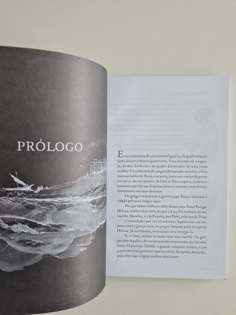 Esta é a história de uma terrível guerra, da qual tomaram parte deuses e bravos guerreiros. Uma história de vingança, de atos heroicos e do poder devastador de uma linda mulher. Uma história de sangue derramado na terra, sob as imensas torres de Troia, e na areia, junto aos navios de proas em curva, de cor carmim, da Grécia. Nessa época, os deuses tomavam partido nas disputas entre os mortais e interferiam diretamente em seus destinos. Os gregos trouxeram a guerra para Troia e sitiaram a cidade por nove longos anos. Por que tantos milhares foram para Troia? Porque Helena, mulher mais bela do que a Lua, foi roubada de seu marido, Menelau, rei de Esparta, por Páris, príncipe de Troia.