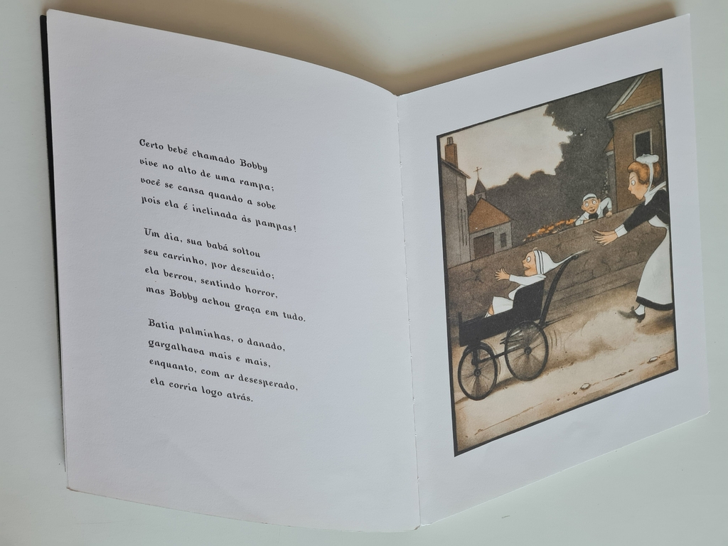 O livro inclinado brinca com as diferentes perspectivas diante de uma mesma situação. As imagens e os versos se complementam e narram as aventuras de Bobby, um bebê que se encontra dentro de um carrinho que é solto acidentalmente ladeira abaixo e ganha velocidade descontrolada, topando em tudo o que encontra pela frente, para diversão de Bobby e desespero dos passantes. Assim, a farra do bebê em seu carrinho altera a rotina daquela ladeira, mexendo com a ordem sem graça das coisas estáticas, tirando as pessoas do seu confortável prumo e colocando tudo em movimento alucinante. A própria forma do livro já chama atenção, pois ele, da forma como é apresentado, não se adequa às estantes convencionais das livrarias, tampouco das bibliotecas, exigindo do proprietário criatividade para acomodá-lo em algum lugar. Resenha Especializada – A Taba: