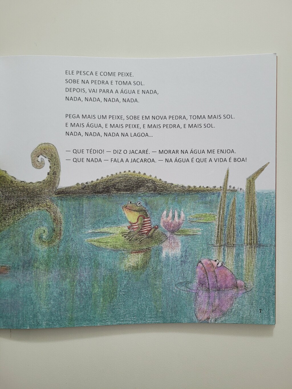 Vida de jacaré é assim: pesca e come peixe, sobe na pedra e toma sol; depois, vai para a água e nada, nada, nada, nada… Jacaré enjoa, jacaroa acha que essa é vida boa! Entediado, jacaré resolve partir e tentar a vida no seco, mas será que ele conhece os segredos da mata? E agora, jacaré?