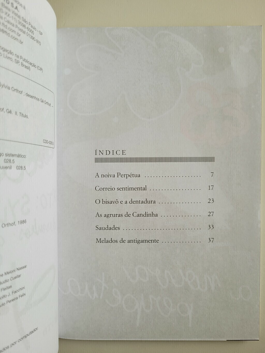 Neste livro Sylvia Orthof nos apresenta seis histórias – a primeira, é de medo, para ler na lua cheia; a segunda, de engraçadas coincidências; a terceira fala de uma dentadura; a quarta é para refletir sobre a velhice; a quinta é uma história bonitasobre mãe; e a sexta é para quem não gosta de regime.