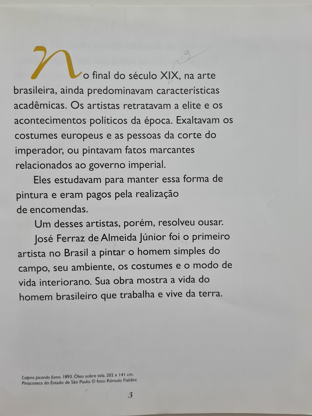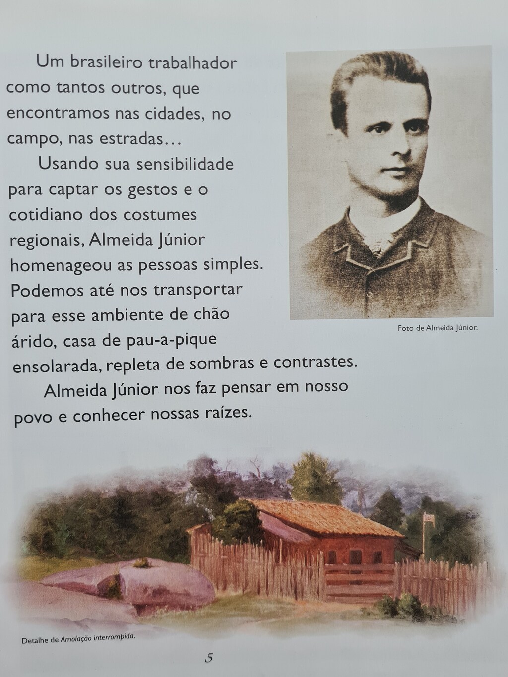 Faltava pouco tempo para o Brasil comemorar seus 400 anos. Nas artes prodeominavam temas ligados a fatos históricos da época; pintavam-se os costumes e as pessoas da corte imperial; a elite burguesa. É quando começa a se impor o talento inovador do jovem Almeida Júnior. Em suas telas ele ousa representar temas autenticamente brasileiros: o homem do campo, seu modo de vida, seu ambiente, seu trabalho. Premiado no Brasil e no exterior, ele retratou com pioneirismo o amor pelo seu país, pela sua cidade e, sobretudo, pela sua gente.