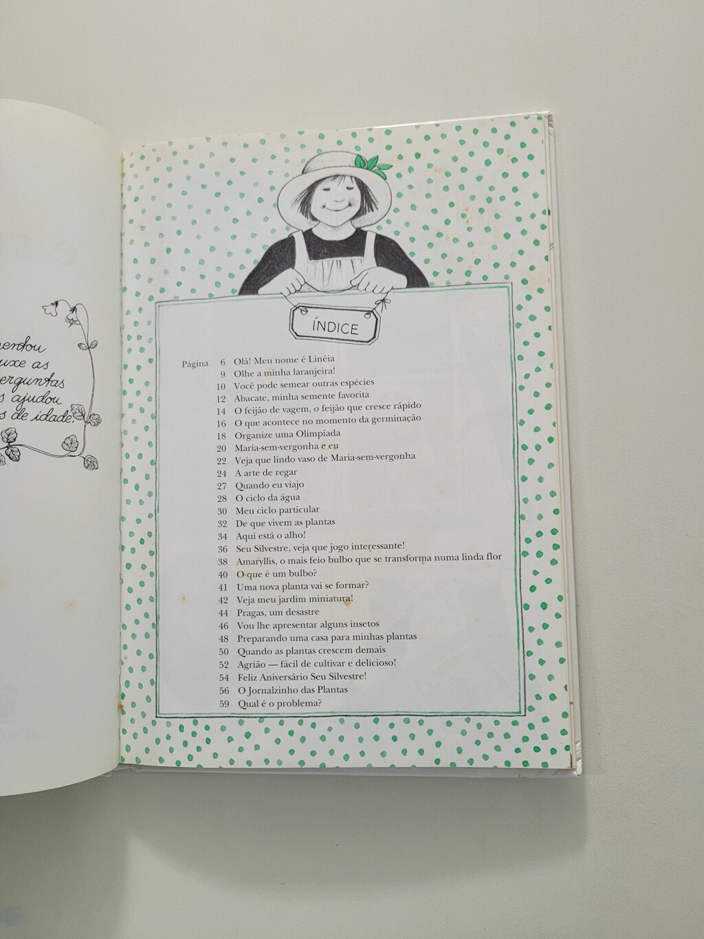 Com a ajuda de Silvestre, um amigo jardineiro, Linéia, menina encantadora e com nome de flor, ensina passo a passo a fazer lindos vasos ornamentais e explica os segredos da germinação, a arte de regar, o ciclo da água, os cuidados diários com estas amigas, as plantas, que têm o mágico poder de transformar nossa casa num ambiente agradável e acolhedor.