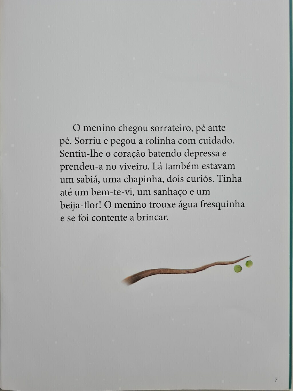Uma obra singela e linda, que toca o coração. Assim é O menino e a rolinha, uma história que conta, de modo breve, a prisão de uma pequena ave num viveiro e o desenrolar dos dias nesta nova situação. Tudo é diferente, inclusive o desalento dos pássaros que, junto com ela, dividem o gradil. Apesar do alimento e da água fresca, a tristeza é imensa. O alento só aparece quando o trinco do viveiro se fecha e o menino que aprisionou os pássaros se vê forçado a passar um dia entre eles. As ilustrações de Elma em desenho e aquarelas são um encanto, trazem ainda mais leveza ao livro, que é válido para todas as idades. Segundo o escritor Jorge Amado, a obra é um doce conto de liberdade.