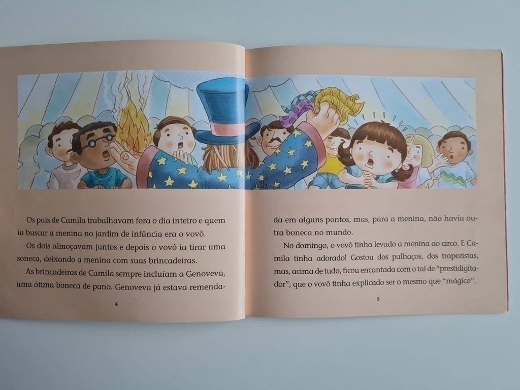 Camila assistiu a um espetáculo de mágicas pela primeira vez na vida e ficou maravilhada! Tão maravilhada que decidiu aprender a tirar moedas do nariz das pessoas, pombas brancas de dentro de lenços e coelhos de cartolas. Coelho ela não tinha nenhum, por isso resolveu usar sua querida boneca Genoveva no lugar do coelho. Mas, e a cartola? E não é que foi encontrar uma justamente no velho baú do Vovô? Mas… ah! Foi só enfiar sua boneca dentro da cartola do Vovô, dizer a palavra mais mágica de que era capaz que… Horror! Que a Genoveva desapareceu de verdade! E agora? O que Camila pode fazer para salvar sua boneca perdida no terrível País das Mágicas Malfeitas?