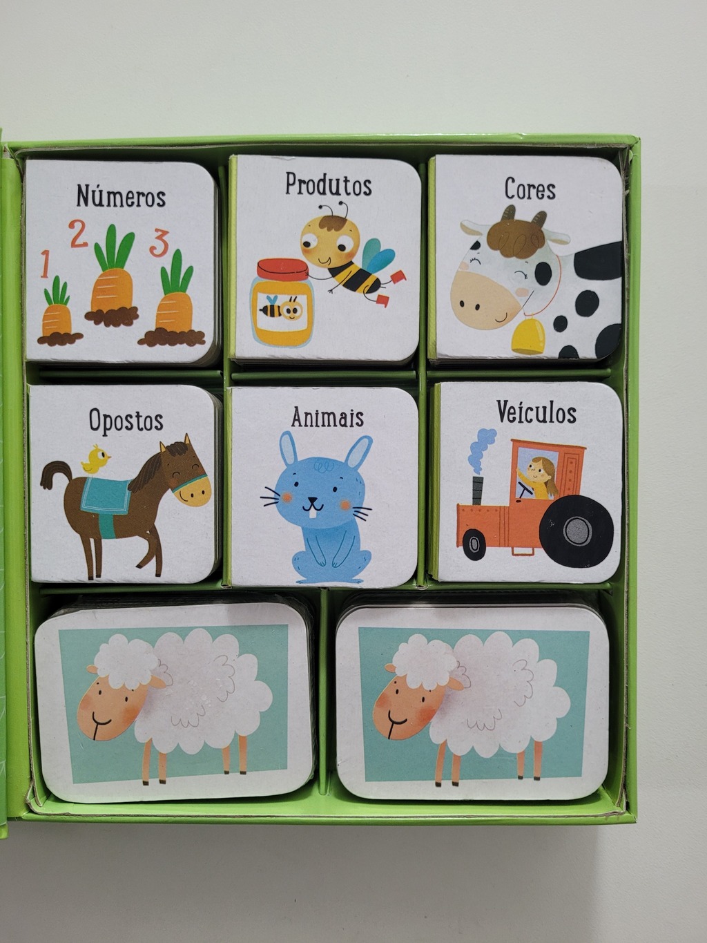 Uma caixa com 6 livros e um incrível jogo da memória, ideal para ensinar novas palavras ás crianças.