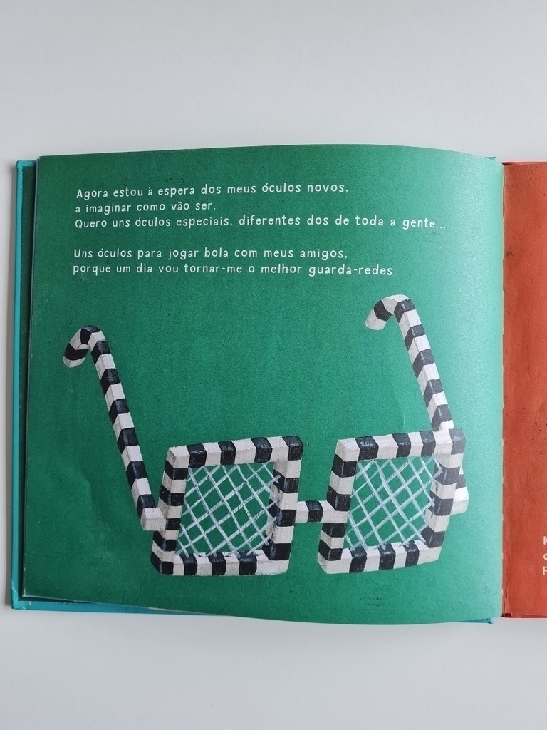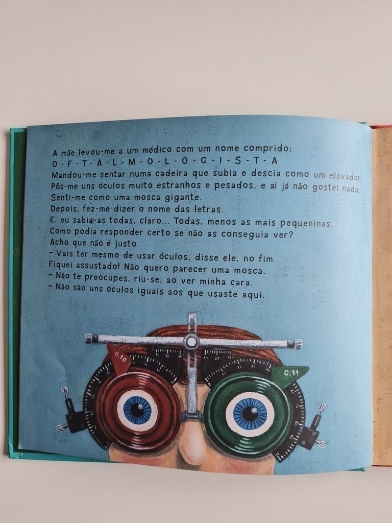 Na visita ao oftalmologista veio a notícia: o menino teria que usar óculos. Um susto. Como serão meus óculos? O que eles vão me fazer enxergar? Que tipo de óculos serão? Ficarei parecendo uma mosca? As ilustrações do premiado André Letria acompanham as dúvidas e elucubrações do pequeno menino, apresentando ao leitor os mais diferentes tipos de óculos. Trata-se de um livro de literatura, mas também um livro de apoio para pais e crianças que vivem essa situação tão comum.