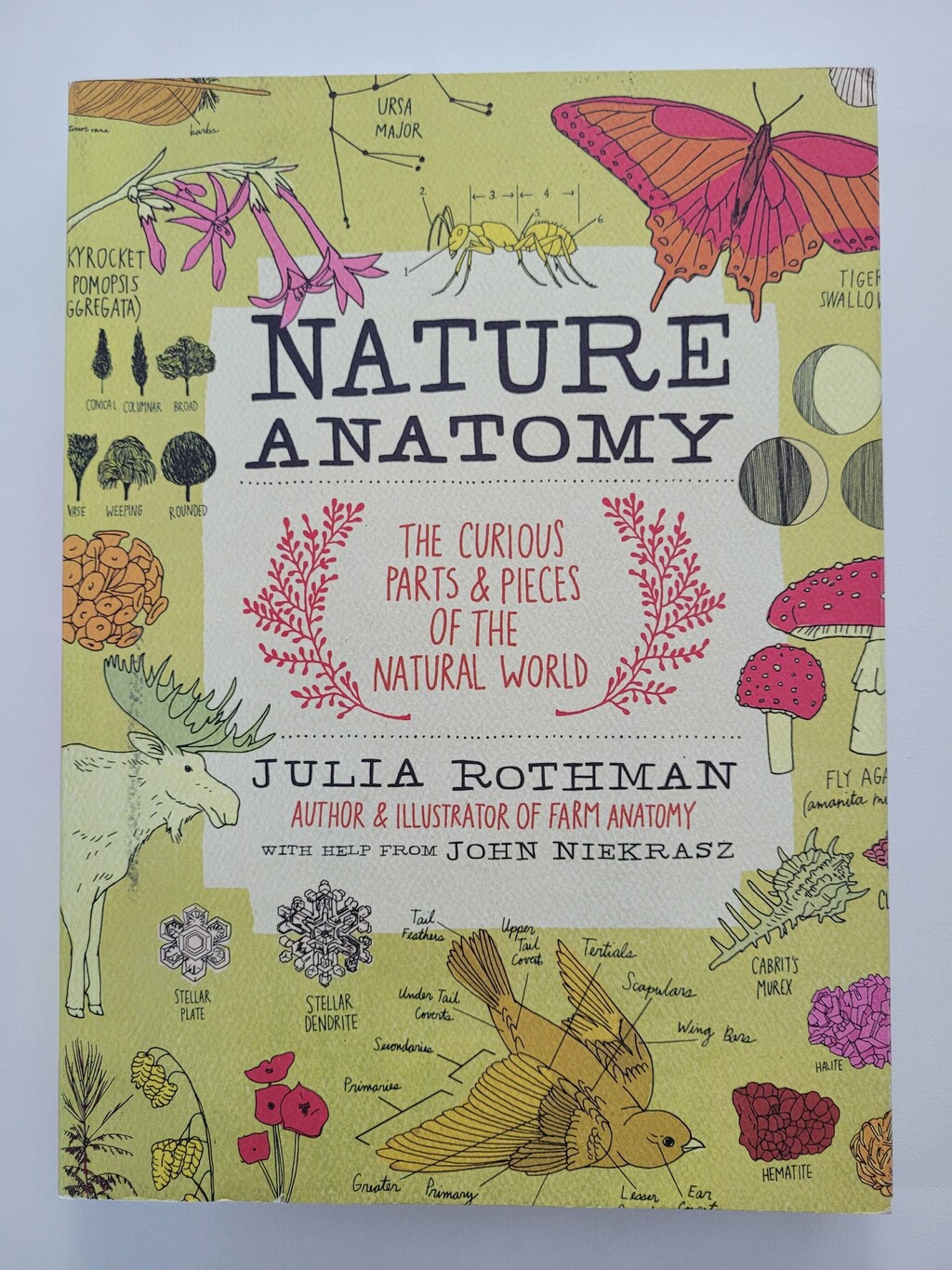 Art and science mingle in Julia Rothman’s fascinating visual tour of the natural world. If you’ve ever wanted to see how mountains are formed or wondered about the life cycle of a mushroom or the differente types of feathers on a bird, you’ll delight in exploring Rothman’s drawinga, diagrams, and dissections. Her spirited exploration of earth and water, flora and fauna will open your eyes to new views of nature’s wonders.