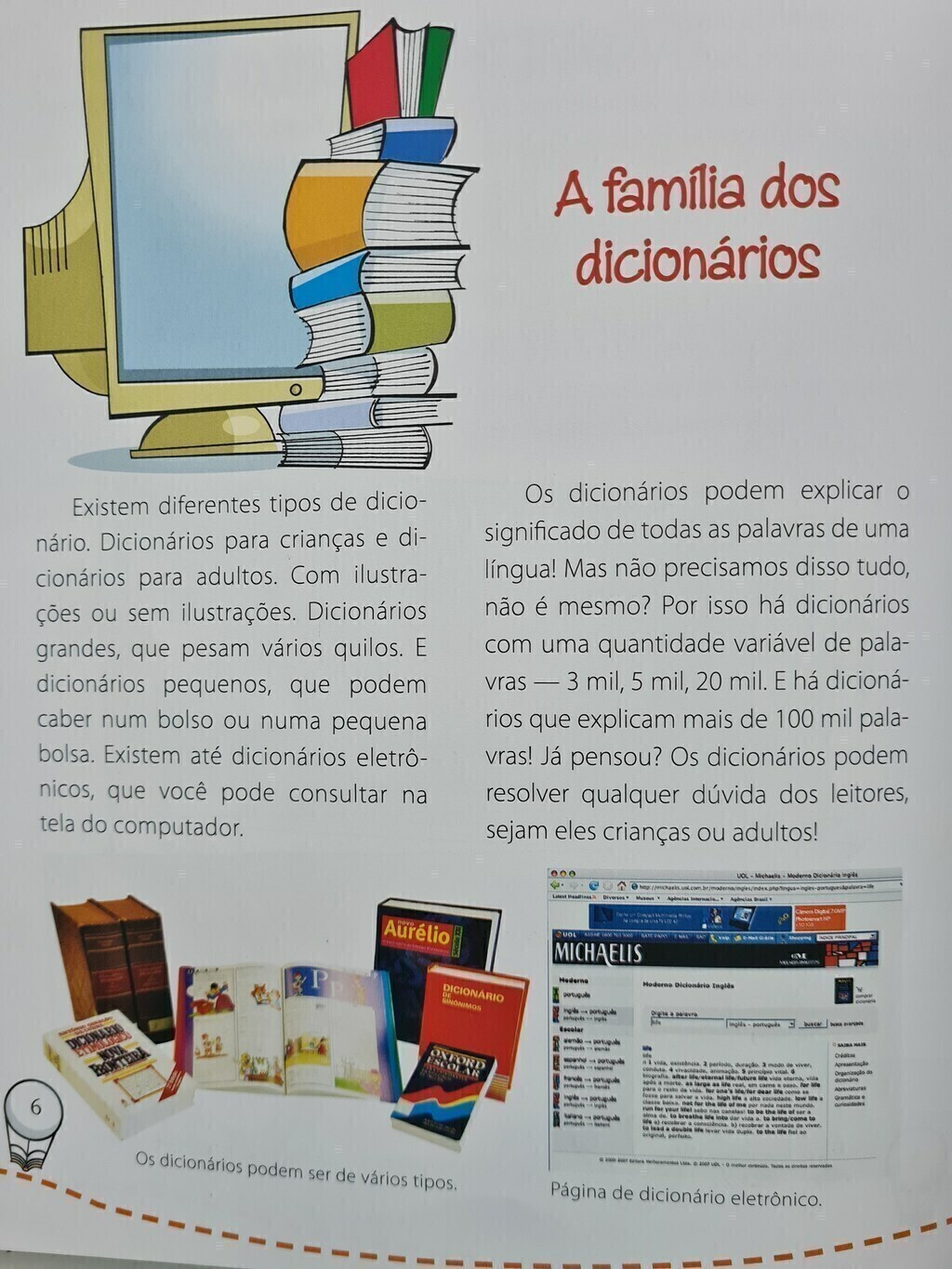 As palavras estão por toda parte. Nos cartazes, nas lojas e até nas camisetas que usamos! Quando abrimos um jornal, uma revista ou um livro, quando ligamos o computador, lá estão elas! Por isso, é muito importante aprender a ler e a escrever, pois assim podemos entender o que elas querem dizer. E com elas podemos também expressar idéias e sentimentos. Mas há tantas palavras que não conhecemos! Já pensou como seria útil um livro que explicasse o significado das palavras? Pois esse livro existe: é o Dicionário. Então, vamos navegar para saber o que é um dicionário e como ele pode nos ajudar a conhecer cada vez mais a língua portuguesa.