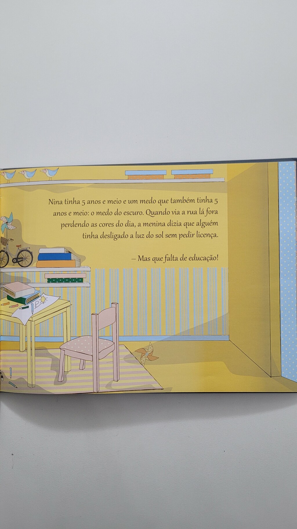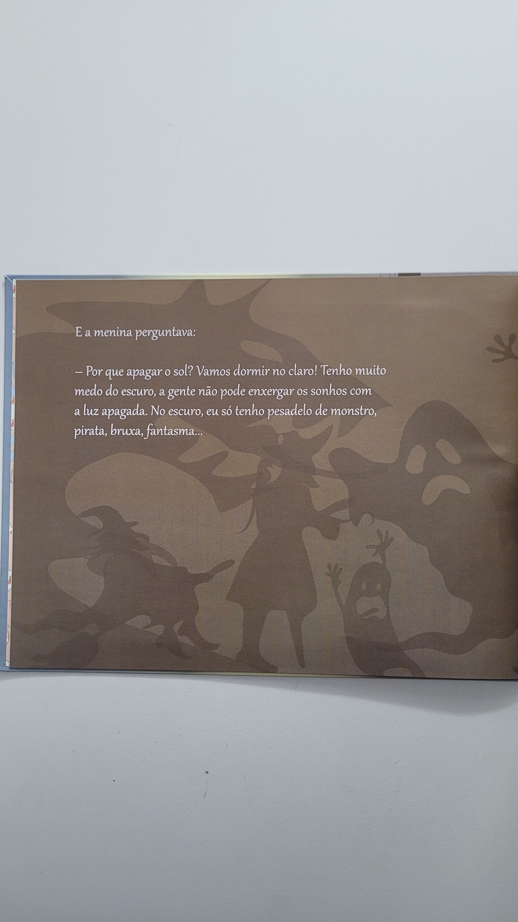 Por que o sol vai embora, deixando a noite tão escura?Quem é que desliga a luz do sol sem pedir licença?Por que temos de dormir no escuro, com pesadelos, bruxas e fantasmas?A partir deste enredo, Claudia Nina trabalha o tema do medo do escuro, bem recorrente na infância, desmistificando na cabeça dos pequenos leitores tudo o que permeia esse rito de passagem.