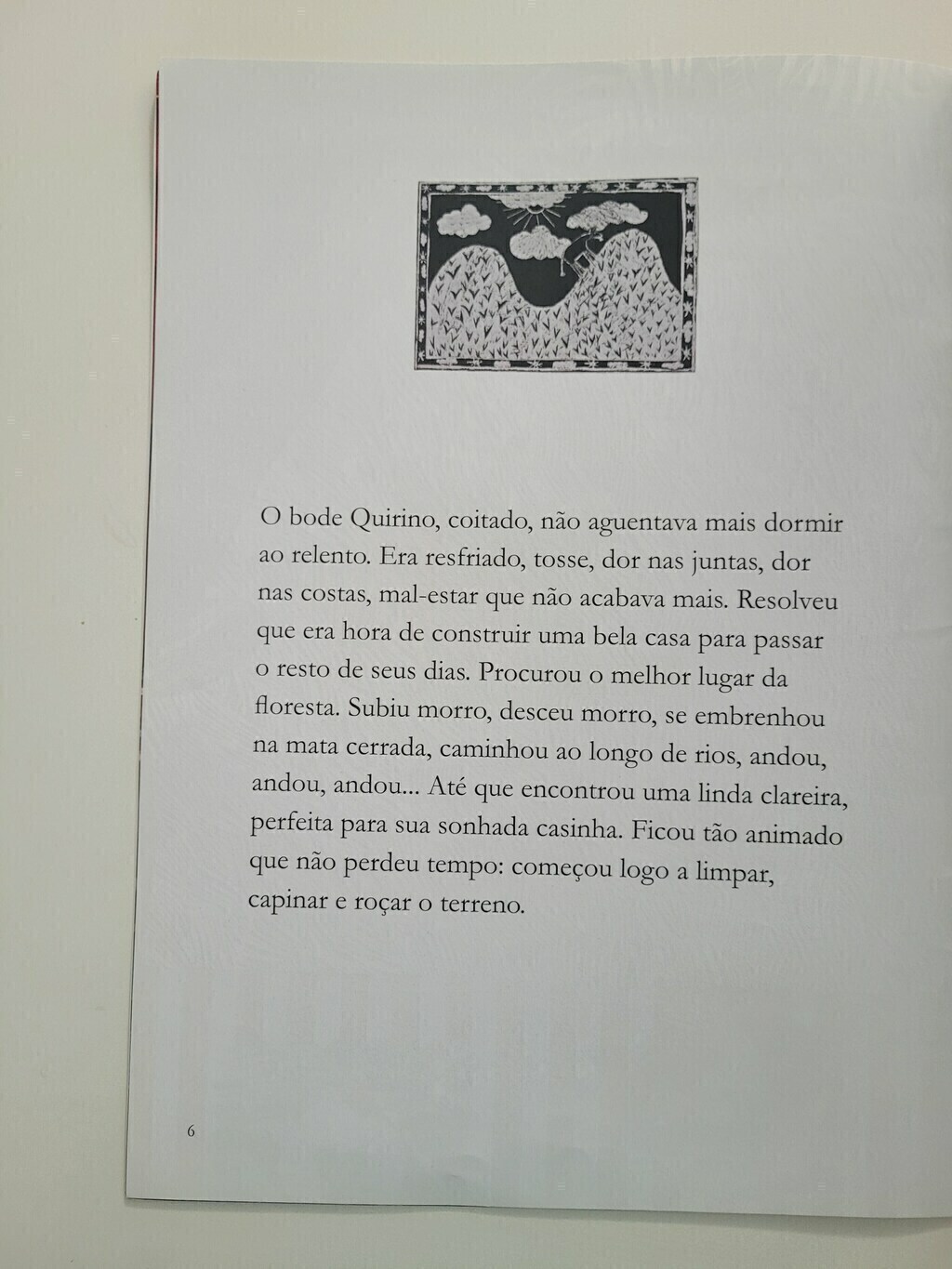 O bode Quirino quer construir sua casa e encontra um terreno limpinho na floresta. Começa a erguer a edificação e em seguida, vai embora descansar. A onça Dolores também deseja uma moradia e vê o mesmo terreno em que o bode esteve. Um conto popular recontado com muito humor, cujo enredo gera muitas confusões e interpretações por parte dos personagens, pois cada um se acha dono do lugar. Dona Onça vê a casa que o Bode construiu e pensa que ganhou um prêmio da divina providência – e o mesmo acontece com o Bode. O final guarda uma surpresa para o leitor, em que a esperteza do mais fraco vence a tirania do mais forte. As imagens de Deborah Engelender, elaboradas com técnica mista composta por fantoches de papel marchê e outros materiais, criam um elo sugestivo com o tema popular do enredo.