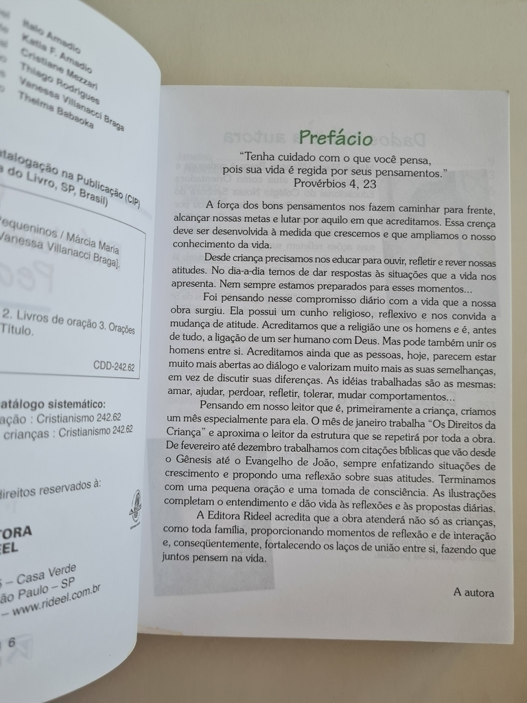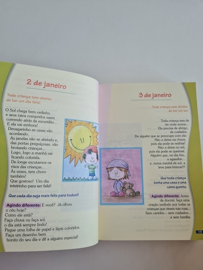 Um livro feito com muito carinho para todos os pequeninos! Citações bíblicas trabalhadas para cada dia do ano, que levam a criança a refletir sobre o que foi familiares, amiguinhos, natureza e outras riquezas da vida. No final de cada mês, atividades lúdicas que promovem a interação e o entendimento da reflexão proposta. Apresenta, de maneira especial, temos como os Direitos da Criança e a reflexão sobre cada um deles. Todas as páginas são ilustradas com lindas crianças em diversas situações.