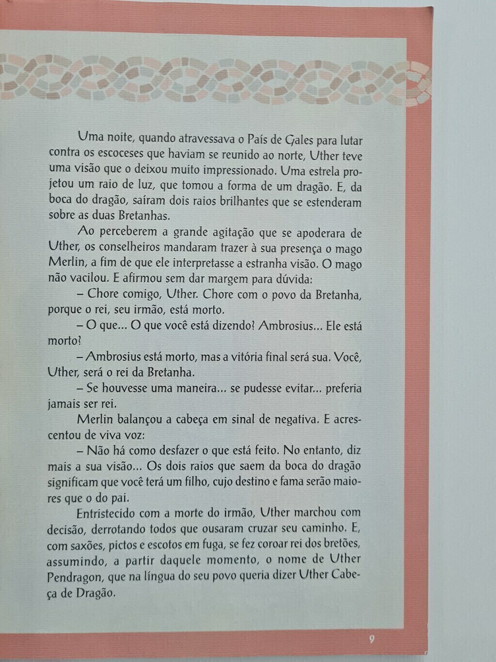 Aos 15 anos, Arthur tornou-se rei dos bretões com uma grandiosa missão a cumprir: expulsar os invasores da Inglaterra e construir uma nação em torno de ideias de bravura e de justiça. Arthur reuniu os melhores cavaleiros do reino, cada um deles um herói, símbolo da nobreza de espírito. E a lenda se fez assim, com magos e feiticeiras, terras fantásticas e espadas mágicas, amor e traição. Talvez a história tenha sido real, ninguém sabe. Importa é que, lendo esta história, toda vez que voce pensar em coragem e aventura vai pensar também em Arthur e nos cavaleiros da Távola Redonda.