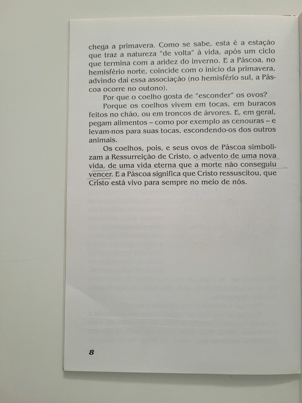 “O coelhinho deixou um ovo para voce!” E, ao ouvir esta frase, em geral pronunciada na manhã do Domingo de Páscoa, os olhos das crianças brilham de alegria. É a comemoração da Páscoa de Nosso Senhor Jesus Cristo que, juntamente com o Natal, constituem as mais importantes festas do cristianismo.