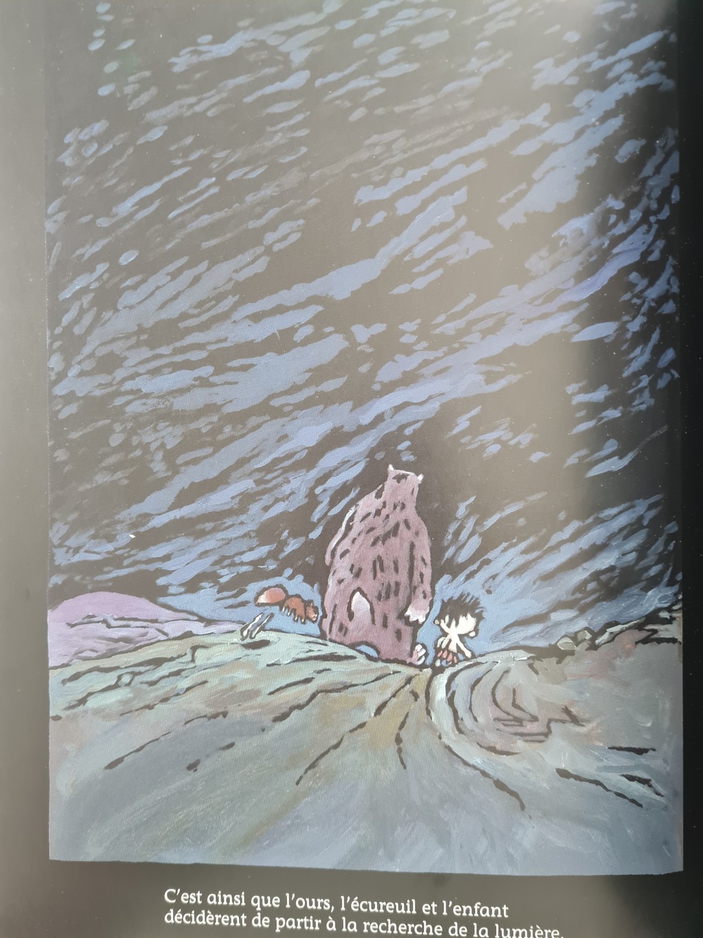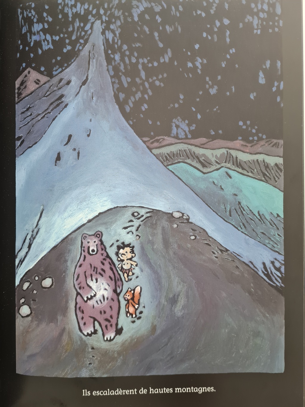 A quel tempo, tutto era buio. Per questo l’orso, lo scoiattolo e il bambino hanno deciso di andare alla ricerca della luce. Per molto tempo non trovarono nulla… Finalmente un giorno, in cima alla montagna, entrarono in una grotta. L’orso vide piccole luci. Grattò la roccia e staccò pezzi di luce. “Guardate cosa ho trovato!” Appendiamoli in cielo, illumineranno la terra. » Guardavano il mondo stupiti.