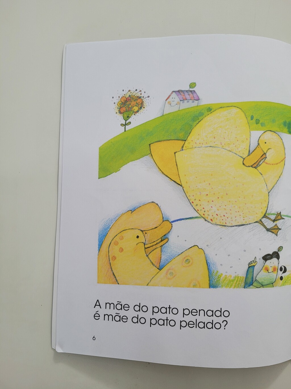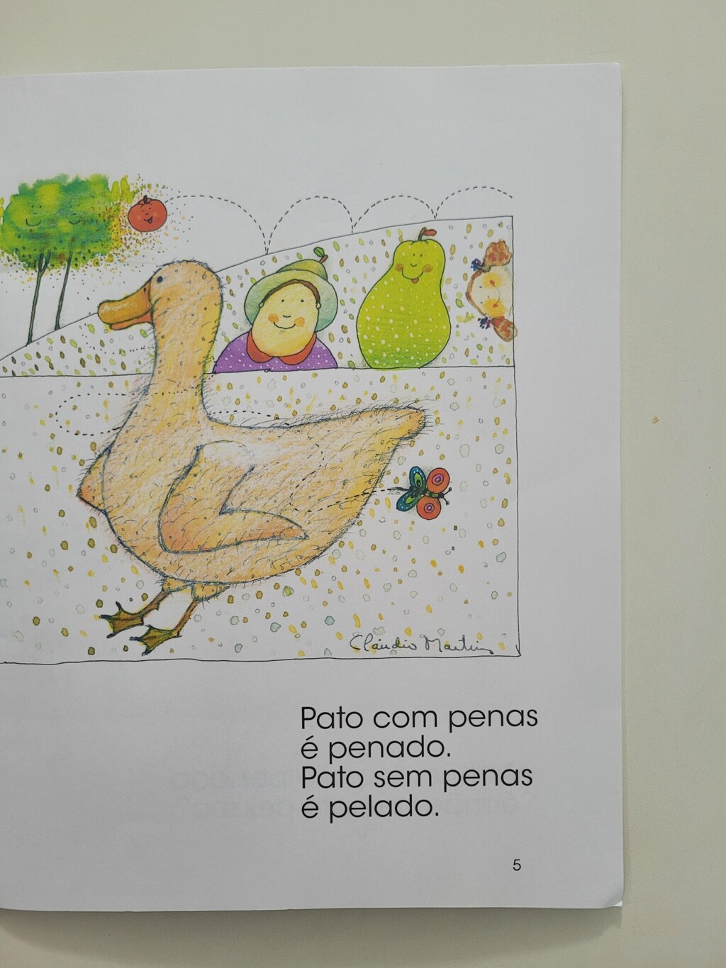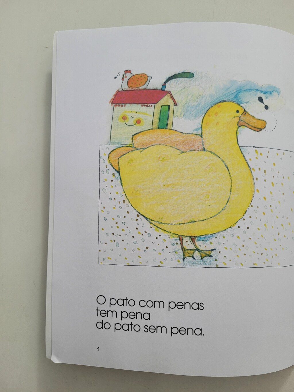 O texto conta a história de dois patos, um pelado, outro penado, problema cuja solução é extremamente original e criativa. Cheio de rimas e aliterações, jogos de sílabas e palavras exploradas com humor e nonsense (quebra repentina do sentido lógico), o texto é também um treino de leitura para crianças recém-alfabetizadas.